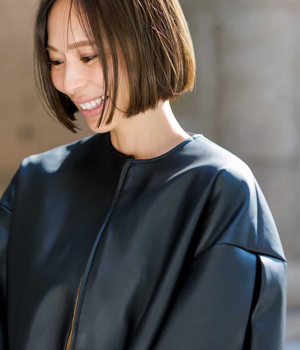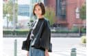 ブルゾンならママ業メインのアクティブスタイルも乗り切れる!レザーブルゾンでも裾にデザインがあるのでデニムやナンバリングTがラフになりすぎず、可愛さとキレイめをキープできるところがお気に入りポイント。ヘアもオイルでツヤと潤い感をキープ。