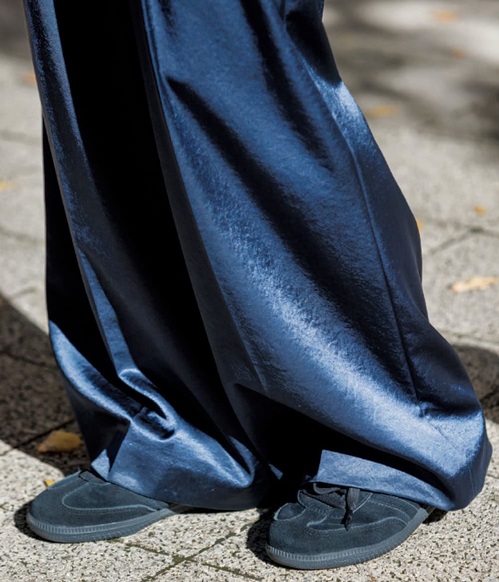 シンプルな日こそ素材感で奥行きを出すように。ベロア×サテンはテク要らずでオシャレに盛れるので安心。シルエットでドラマティックに魅せられて、少し光沢のある素材感もお気に入りのトレンチは頼れる一着。スニーカーもネイビーで統一、カジュアルモードに。