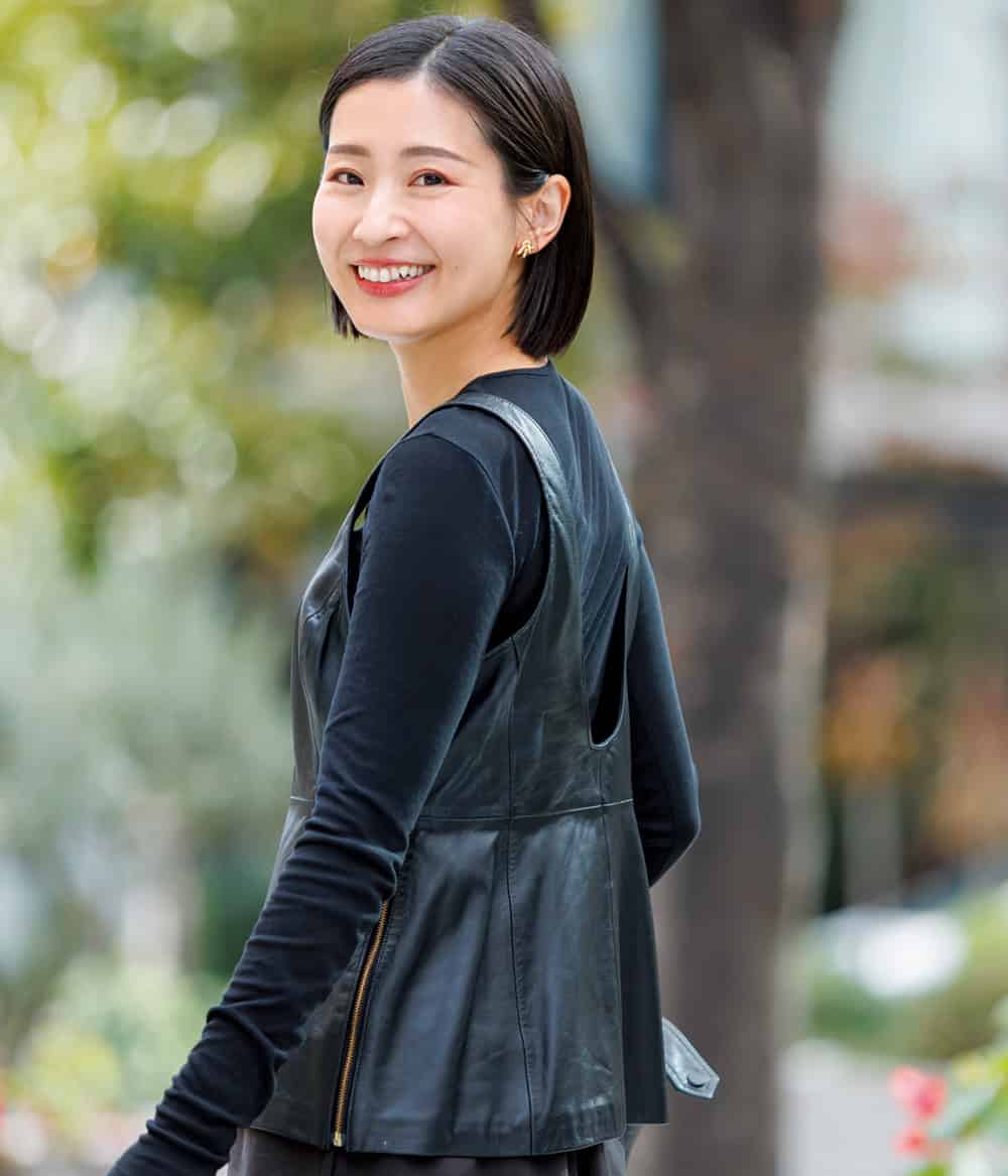 実家の帰省先では車移動も多いので、足捌きがよく風も通さない楽ちんなレザーガウチョが最適。久々の再会ランチにはミッキートップスで遊びを利かせます。最近、ジュエリーはホワイトゴールドにハマり中。バッグやブーツはブラックでも女っぽさがあるものを。