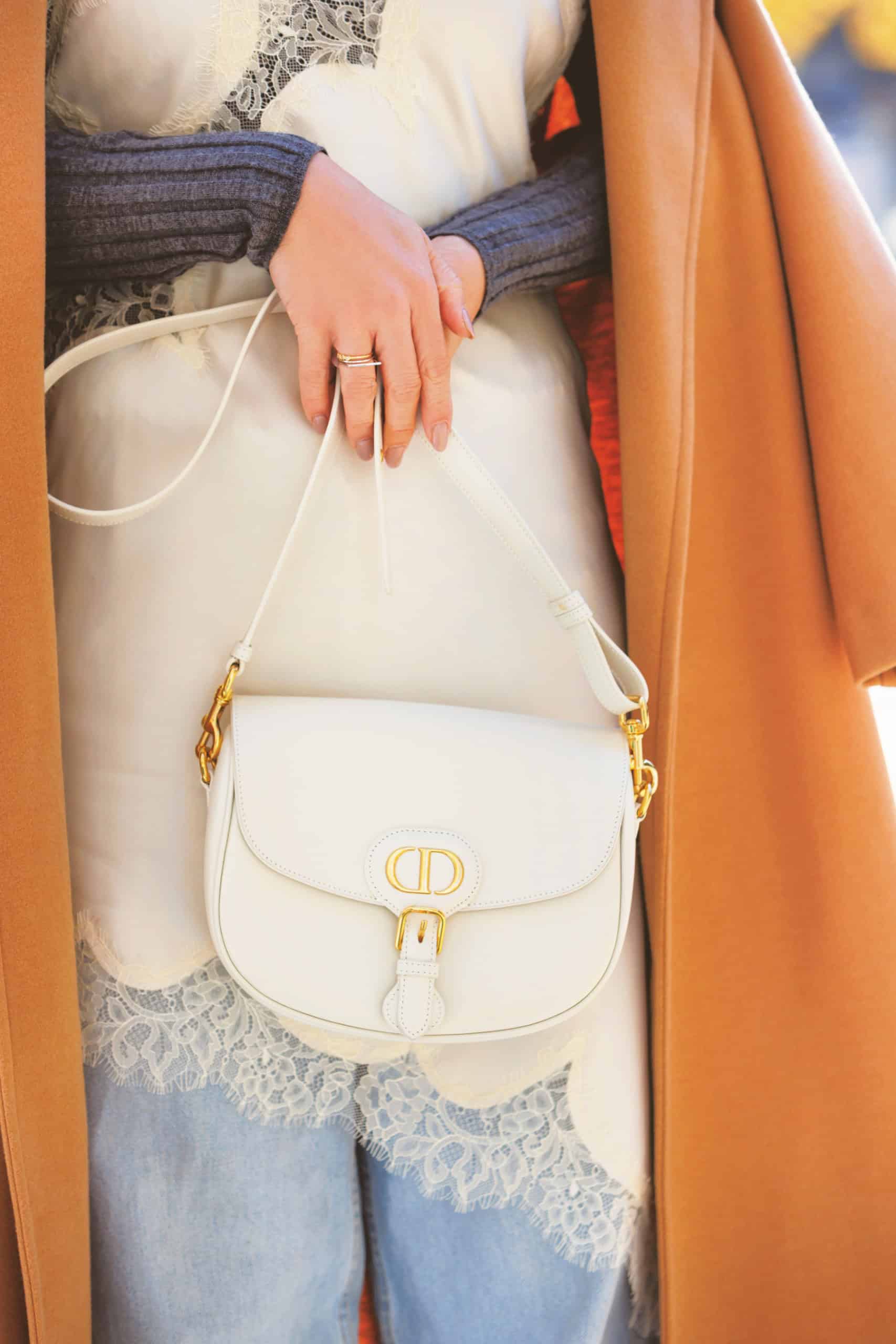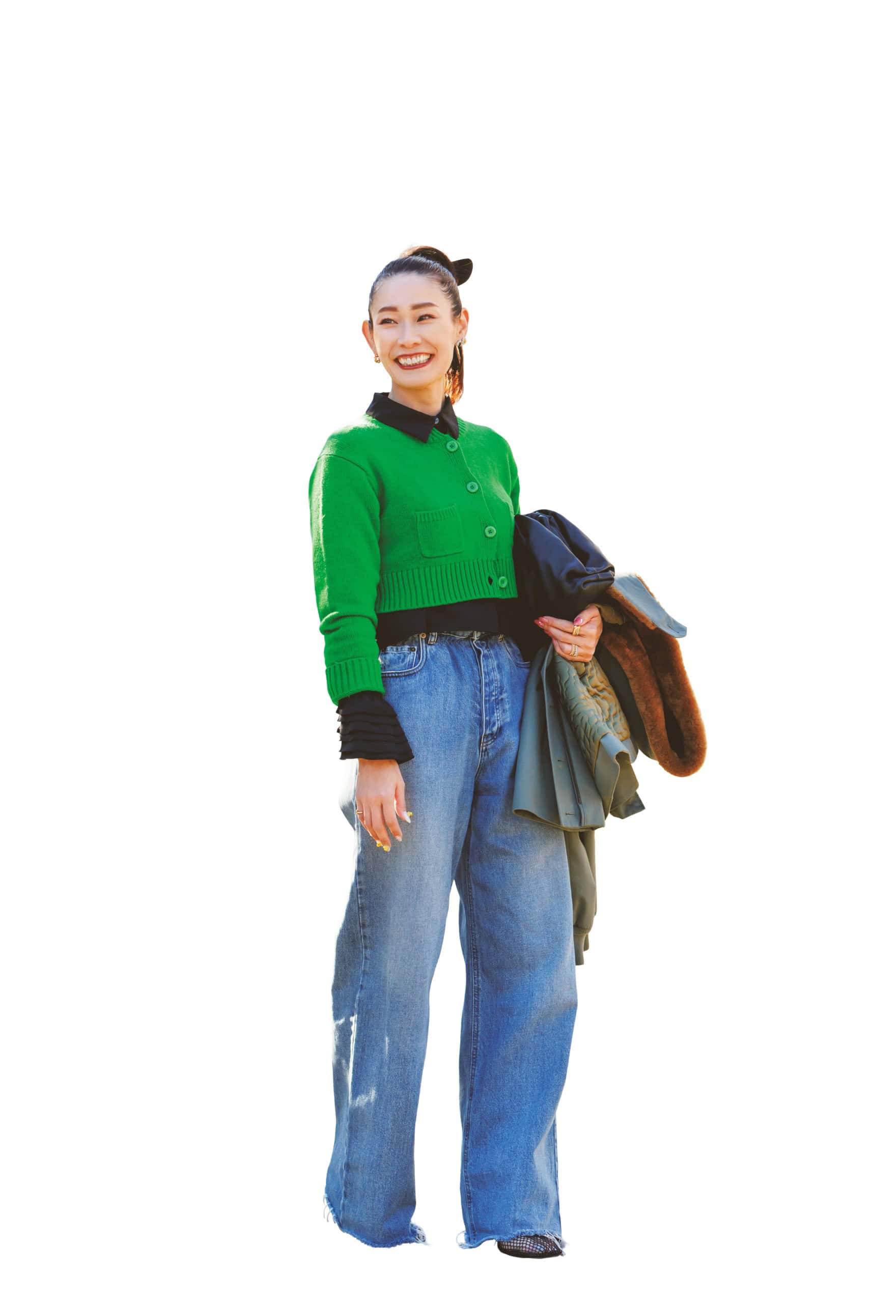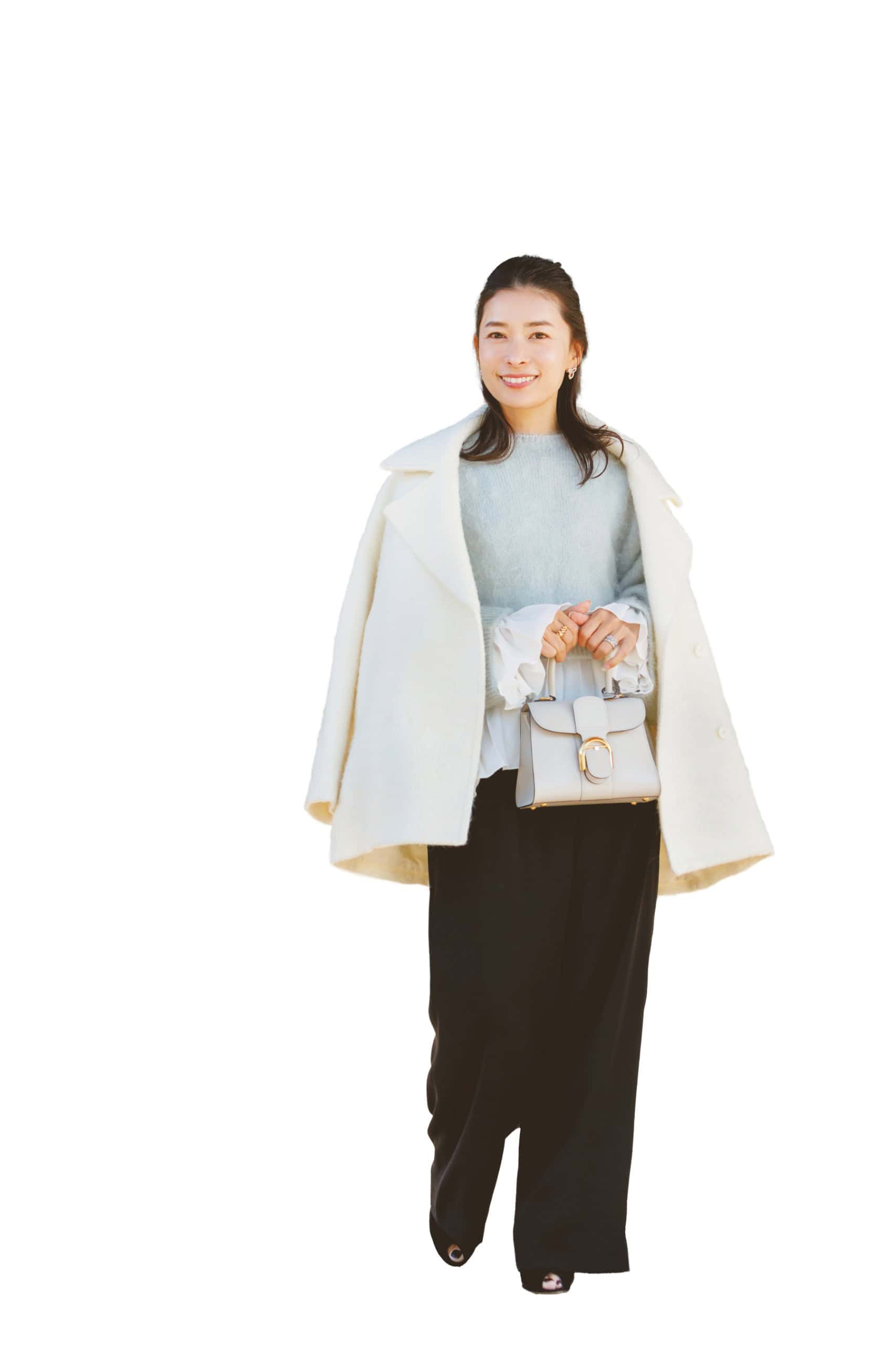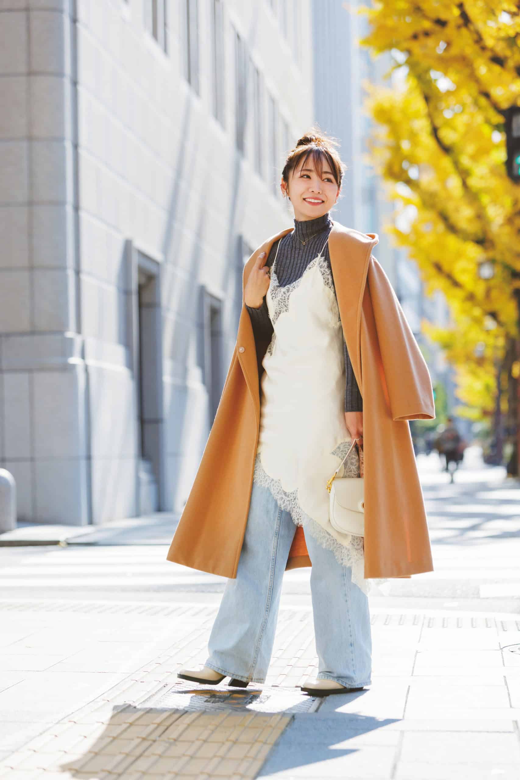 薄手の白タートルを仕込むことで、冬素材のふわふわジャケットも軽やかな印象に。ミニスカはブラウンで引き締めて大人バランスに調整。季節をまたぐ今こそ楽しめる着こなしです。