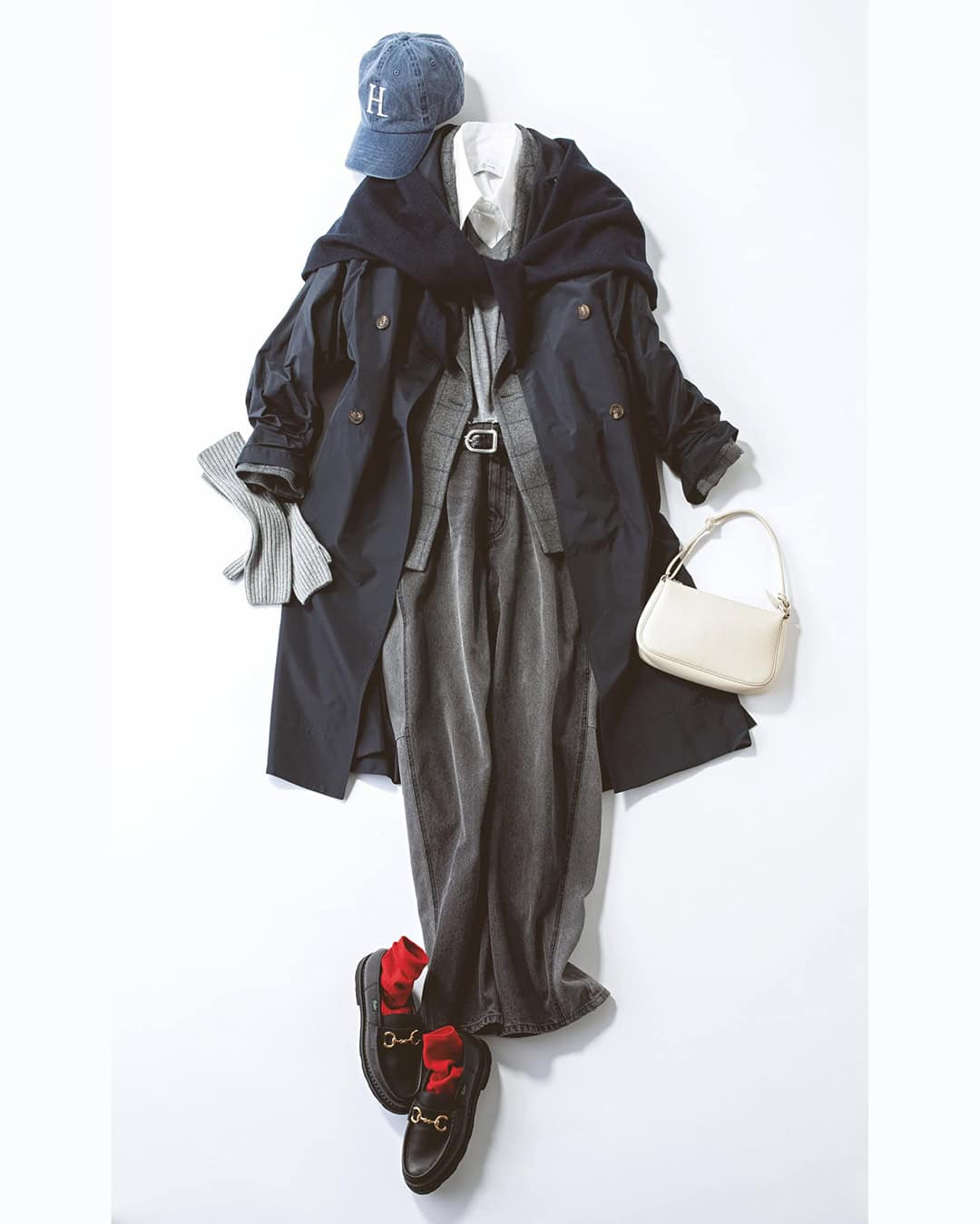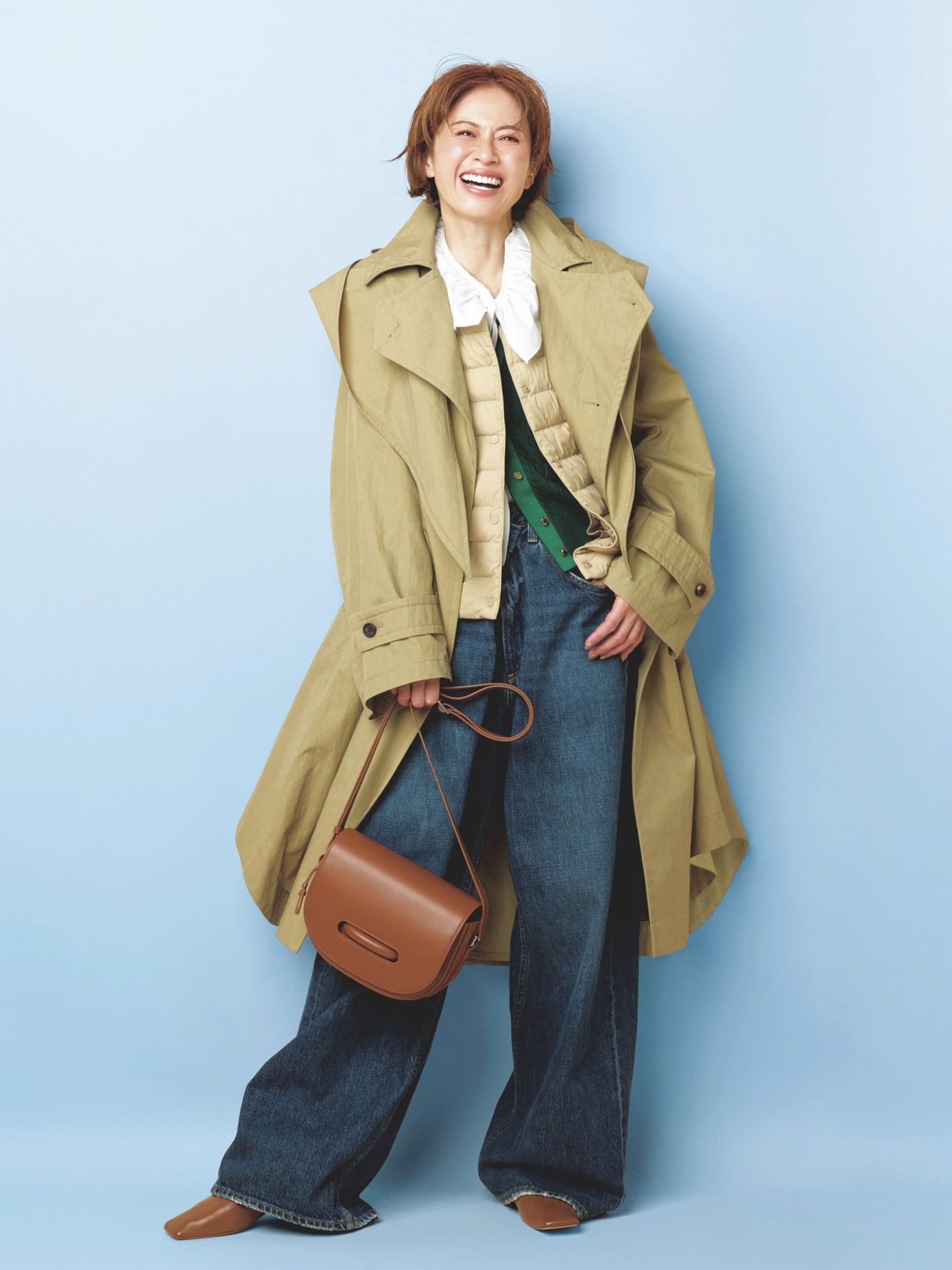 撥水トレンチコート¥132,000(デパリエ 伊勢丹新宿店)ジャケット¥37,400(ミースロエ/ミースロエ ルミネ新宿1店)ニット¥18,700シャツ¥20,900(ともにブロッサム)デニム¥17,930(メゾンスペシャル 青山店)バッグ¥33,000 (ヴァジック/ヴァジックジャパン)シューズ¥96,800(パラブーツ 青山店)ベルト¥52,800(デアンシェ/エスアンドティ)キャップ¥6,490(ヘルシーデニム/ゲストリスト)ストール¥4,990(アンフィーロ)アームウォーマー¥18,700 (アソース メレ/アイネックス)ソックス(スタイリスト私物)