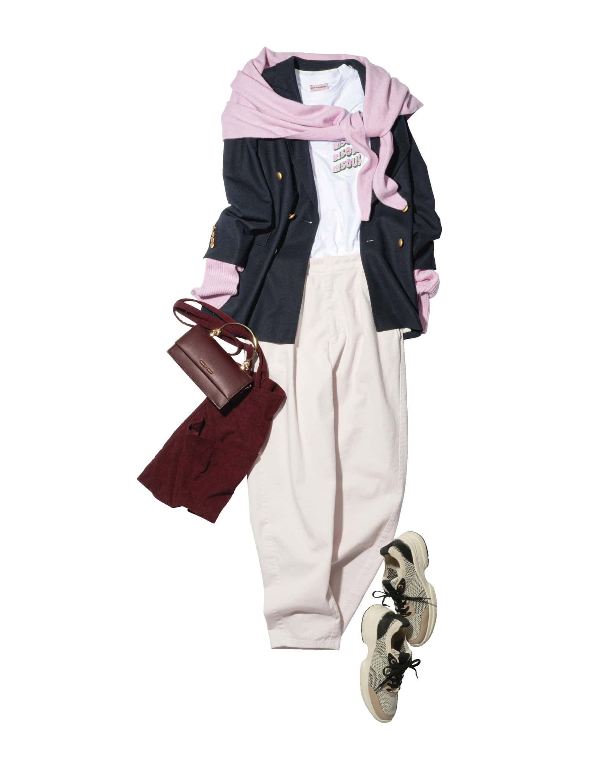 ジャケット¥97,900(ニアー ニッポン/ニアー)Tシャツ¥13,200〈BISOUS SKATEBOARDS〉パンツ¥44,000〈THIRD MAGAZINE〉(ともにTHIRD MAGAZINE)ニットストール¥4,990アームウォーマー¥3,990トートバッグ¥3,990(すべてアンフィーロ)バッグ¥9,900(チャールズ&キース/チャールズ&キース ジャパン)スニーカー¥15,990(ステッピ)