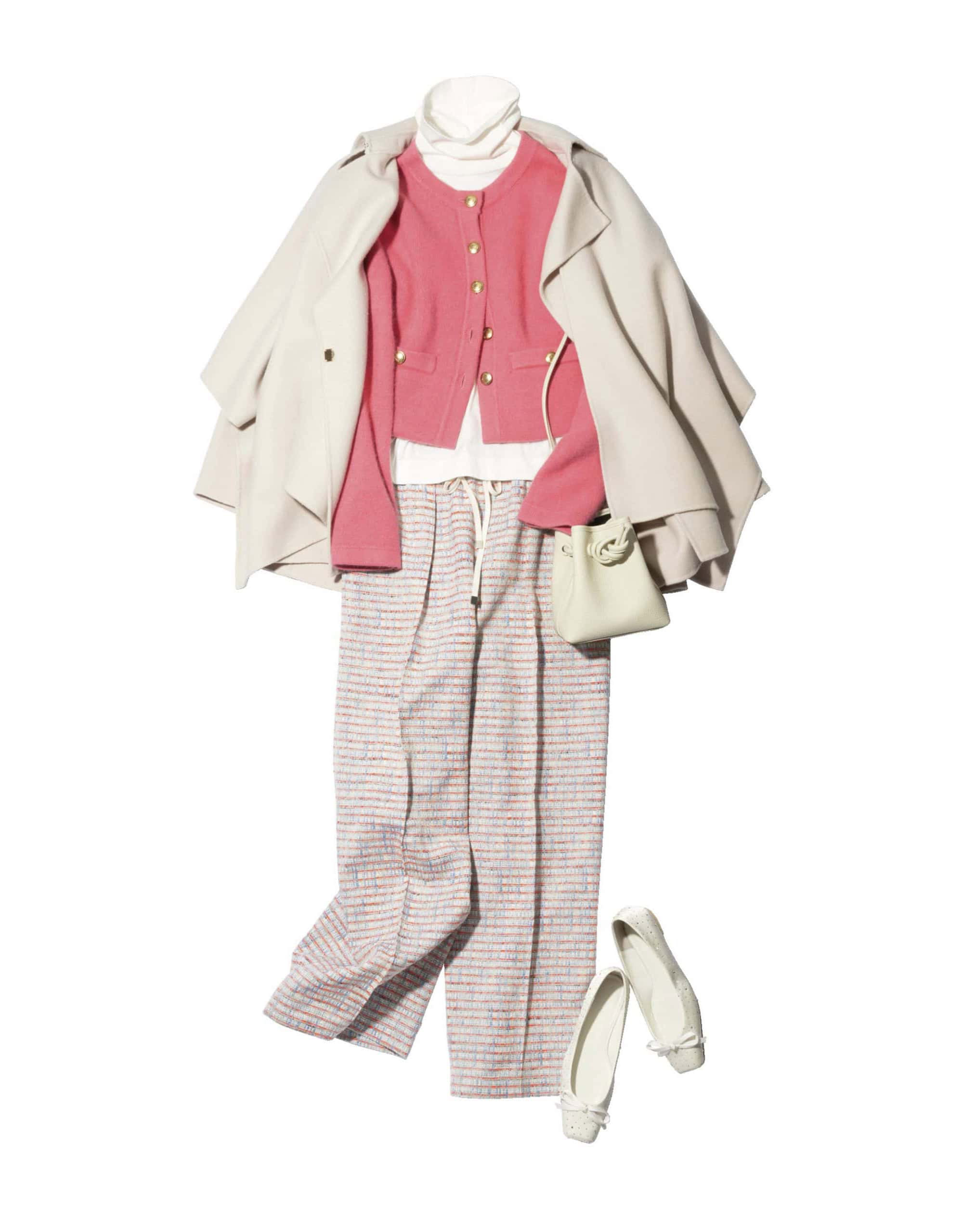 カーディガン¥27,500(マイストラーダ/マイストラーダ プレスルーム)コート¥66,000(カデュネ/カデュネ プレスルーム)タートルネックカットソー¥14,300(スローン/ザ スローン ショップ 新静岡セノバ店)ツイードパンツ¥72,600(ebure/リトルリーグ インク)バッグ¥44,000(ヴァジック/ヴァジックジャパン)パンプス¥29,700(ツル バイ マリコ オイカワ)