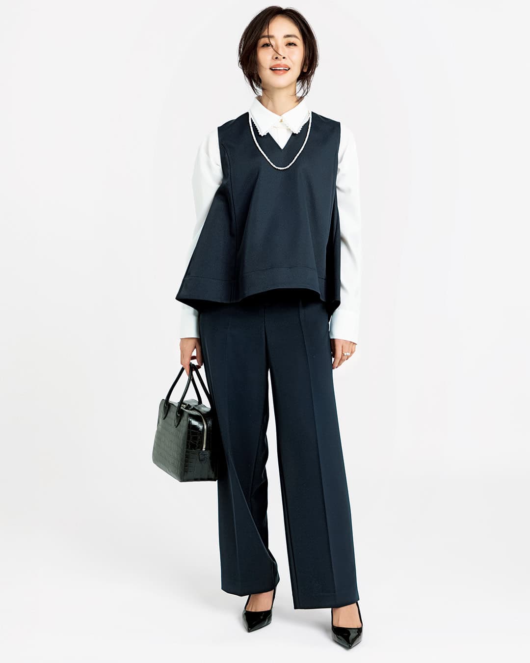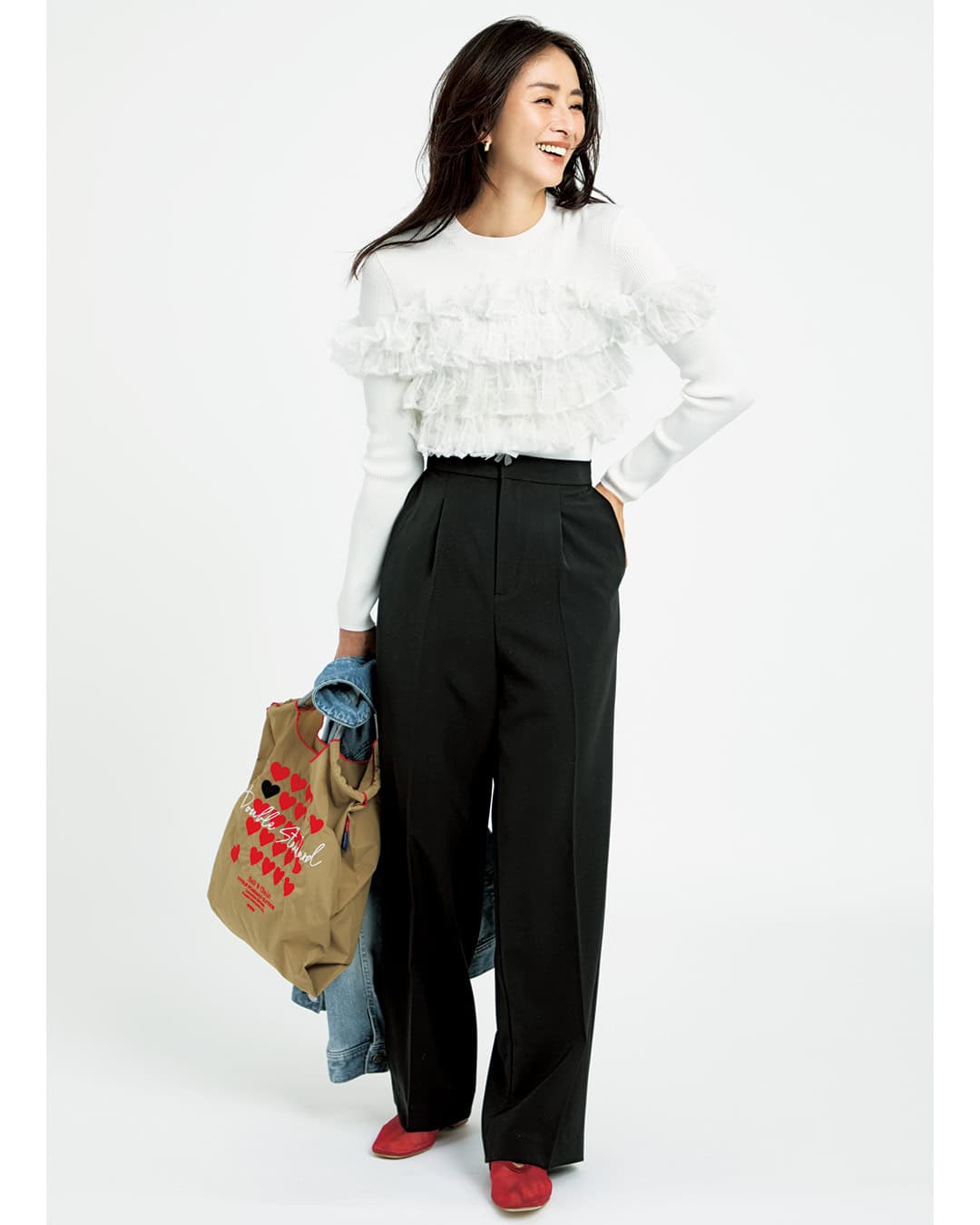 ②シーンレスに活躍!美脚を作る「タックワイドパンツ」