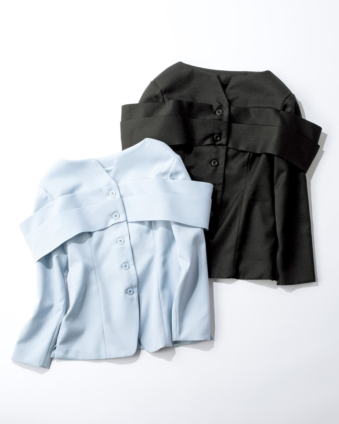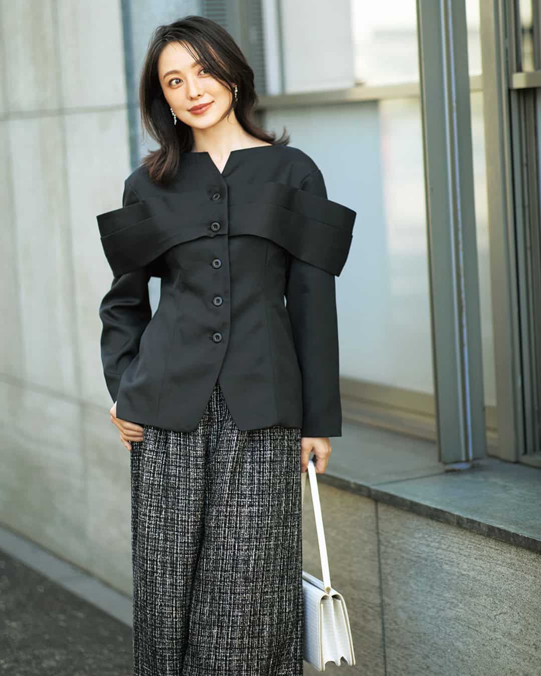 ➀小顔効果が狙える!立体デザインが高見えする「レイヤードショルダージャケット」