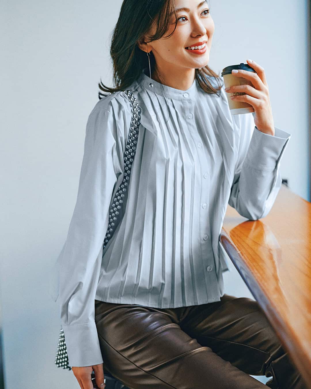 ブラウス¥19,580(ミュール)パンツ¥20,900(ジャスグリッティー/ジャスグリッティー プレスルーム)バッグ¥42,900(オルセット/オルサ)ピアス¥27,500(リューク)