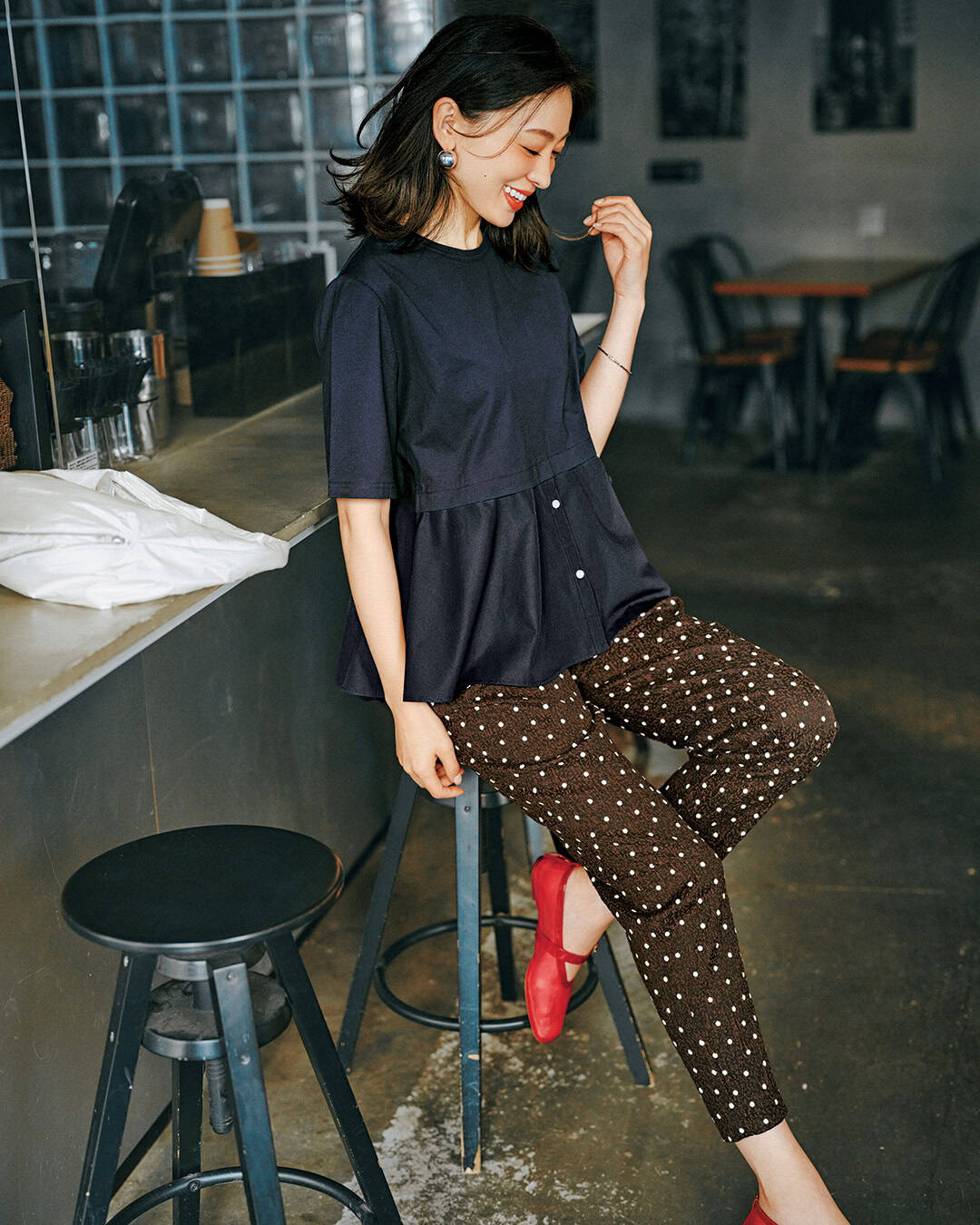 <写真1枚目>トップス¥15,400(アレア)パンツ¥4,990(ユニクロ)バッグ¥16,500(ダイアナ/ダイアナ 銀座本店)パンプス¥53,900(コルコバード/フィルム)