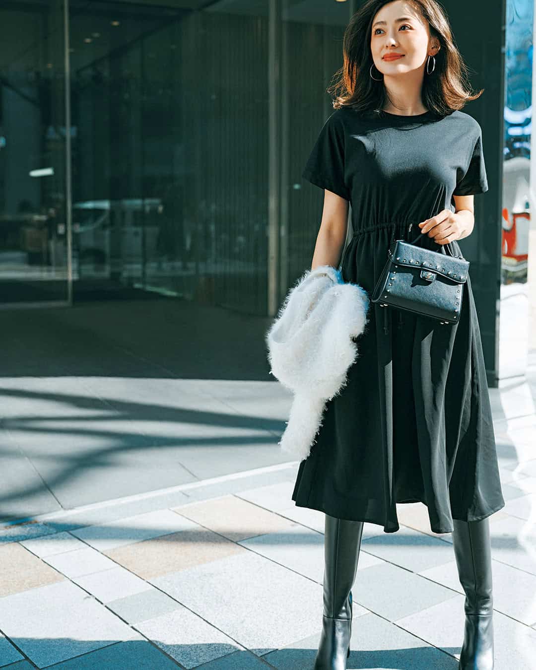 ワンピース¥18,500(セルヴァセグレタ)カーディガン¥18,920(アルページュストーリー/アルページュストーリー プレスルーム)バッグ¥15,950ブーツ¥42,900(ともにダイアナ/ダイアナ 銀座本店)ピアス¥168,300(ウノアエレ/ウノアエレ ジャパン)