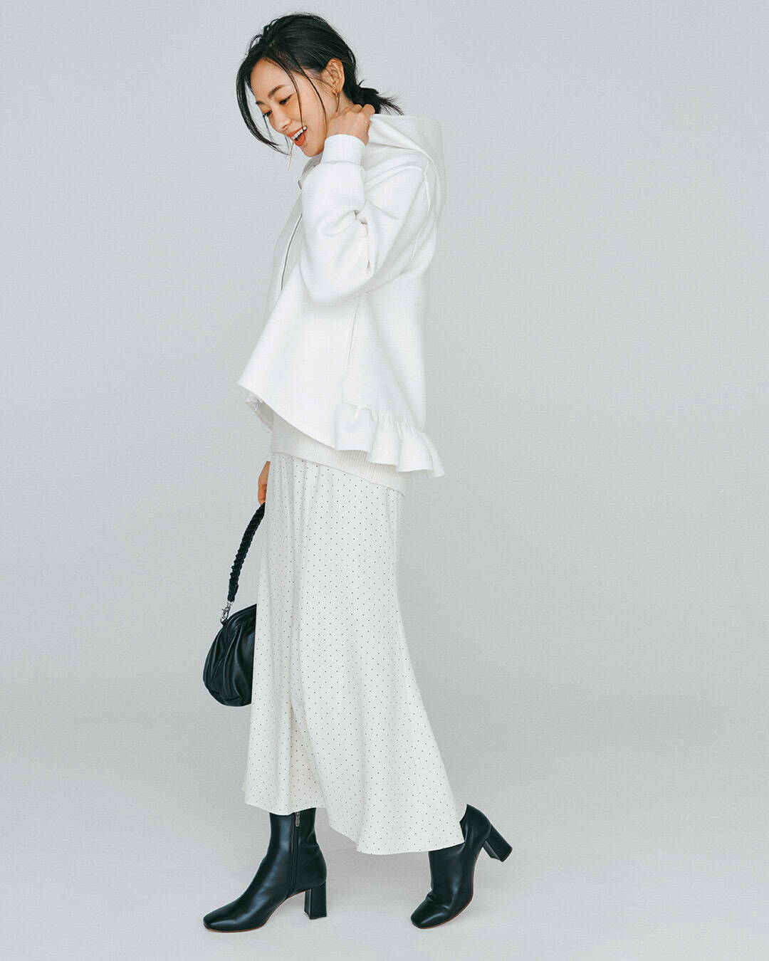 <写真2枚目>パーカ¥16,500(スパン)ニット¥22,000(カデュネ)スカート¥3,990(ユニクロ)バッグ¥41,800(リンク)ブーツ¥28,600(ダイアナ/ダイアナ 銀座本店)