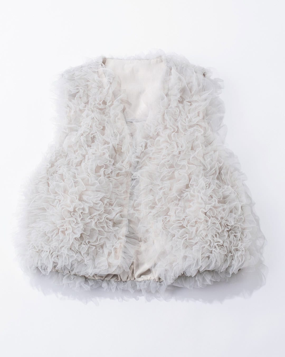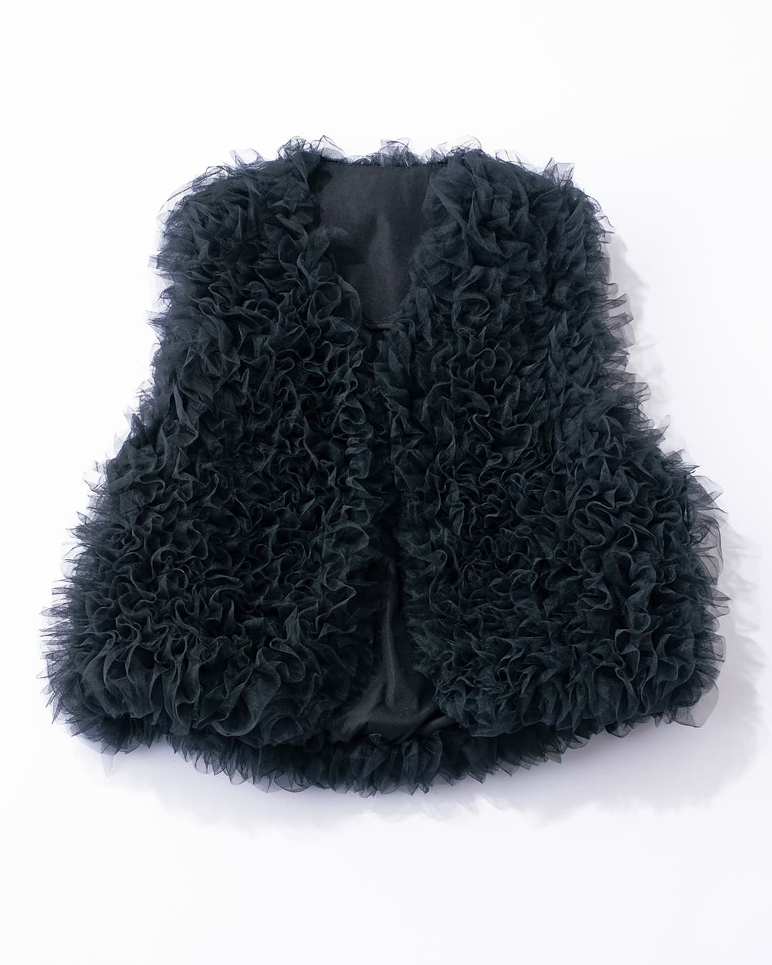 シンプルトップスを華やかコーデに昇華させる人気のジレ。去年春に大人気だったミニ丈のチュールジレがパワーアップして登場。フリルチュールを別生地に縫い留めたクチュール感ある手の込んだ素材を使用。チュールは上から下に縦方向に向かっているので視線を縦に誘導し、着膨れの心配なくすっきりと着られます。身頃にタックの入ったコクーンシルエットだからのっぺりとも見えません。季節を選ばず長くコーデに使えるのもポイント。