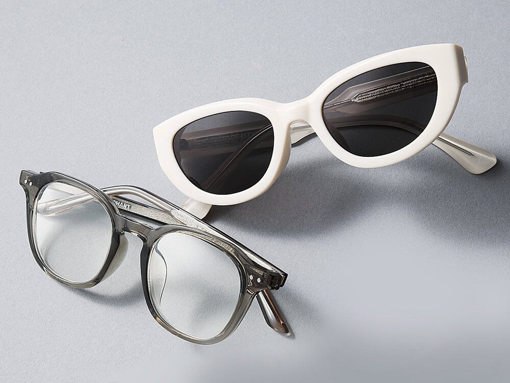 〈上から〉キャットアイのキャッチーな白フレーム。(ライター私物)顔馴染みの良いクリアグレー(ライター私物)