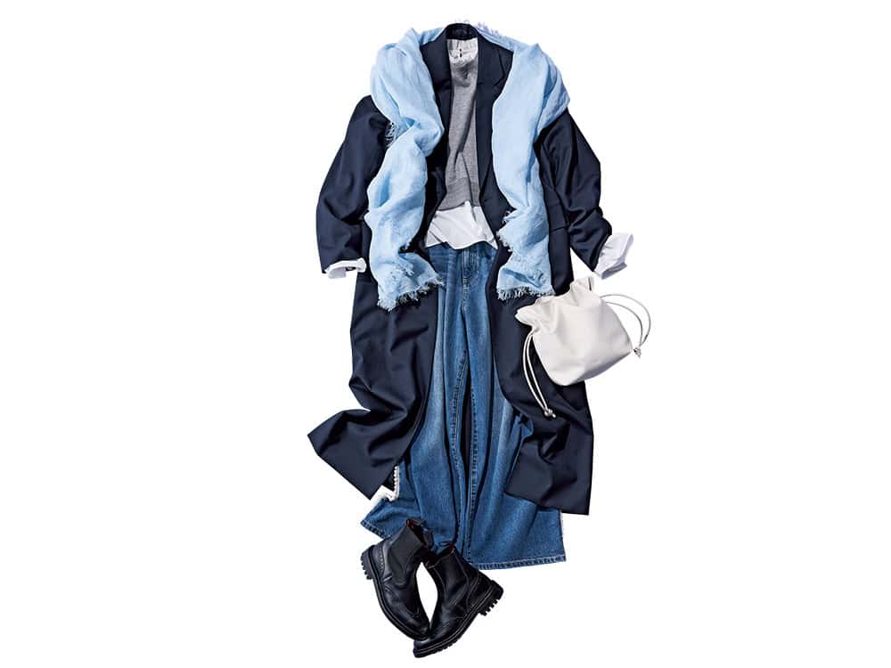 ロングコート¥88,000(ロエフ/エイチ ビューティー&ユース)スウェットトップス¥17,600(ルーニィ)パール付きデニムパンツ¥23,100(カデュネ/カデュネ プレスルーム)フリルブラウス¥7,920(クロエンス/ワールド プレスインフォメーション)ストール¥29,700(アソース メレ/ ユナイテッドアローズ スクランブルスクエア店)巾着バッグ¥45,100(ヴァジック/ヴァジックジャパン)ショートブーツ¥143,000(トリッカーズ/トリッカーズ 青山)