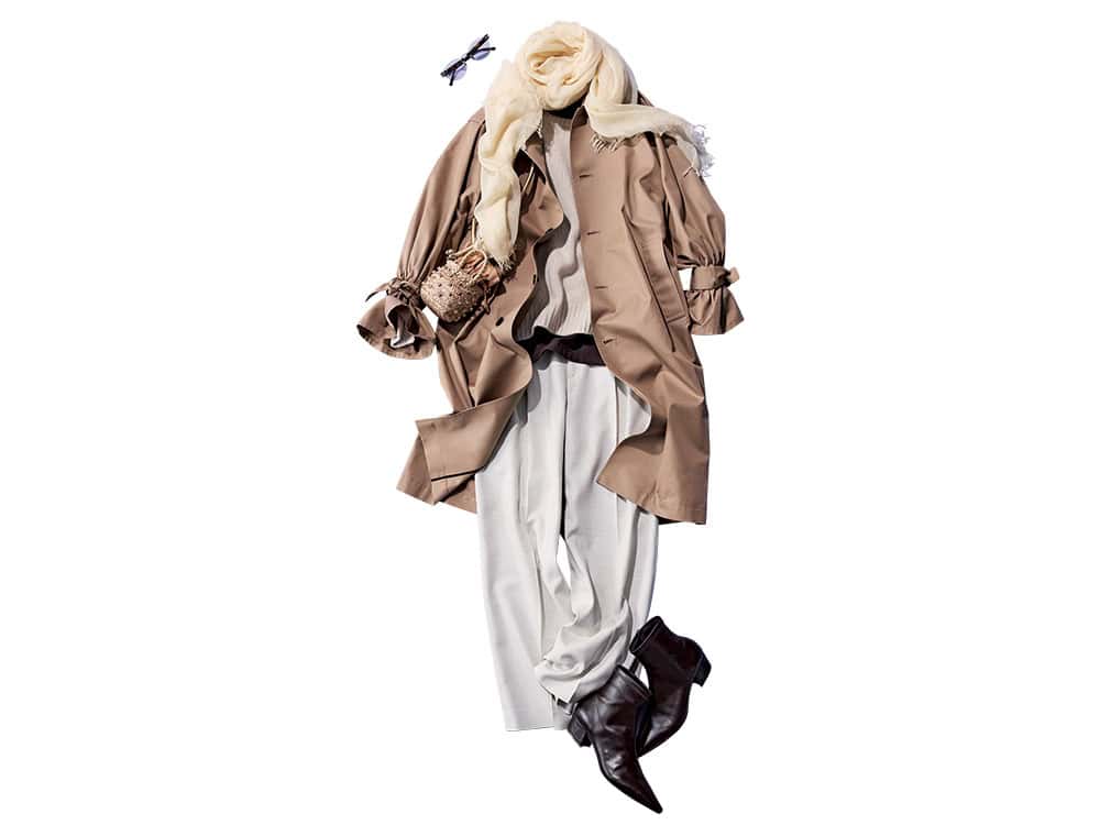 変形トレンチコート¥102,300(ニアーニッポン/ニアー)ニット¥44,000(ザハイライツ)ブラウンTシャツ¥12,100(エス/合同会社sense)ワイドパンツ¥39,600(マルティニーク/マルティニーク ルミネ横浜)ストール¥16,500(ガリャルダガランテ/ガリャルダガランテ 青山店)メガネ¥44,000(プロポ/プロポデザイン)ビジューバッグ¥77,000(LE NINE/TOMORROWLAND)ブラウンショートブーツ¥13,000(PLST)