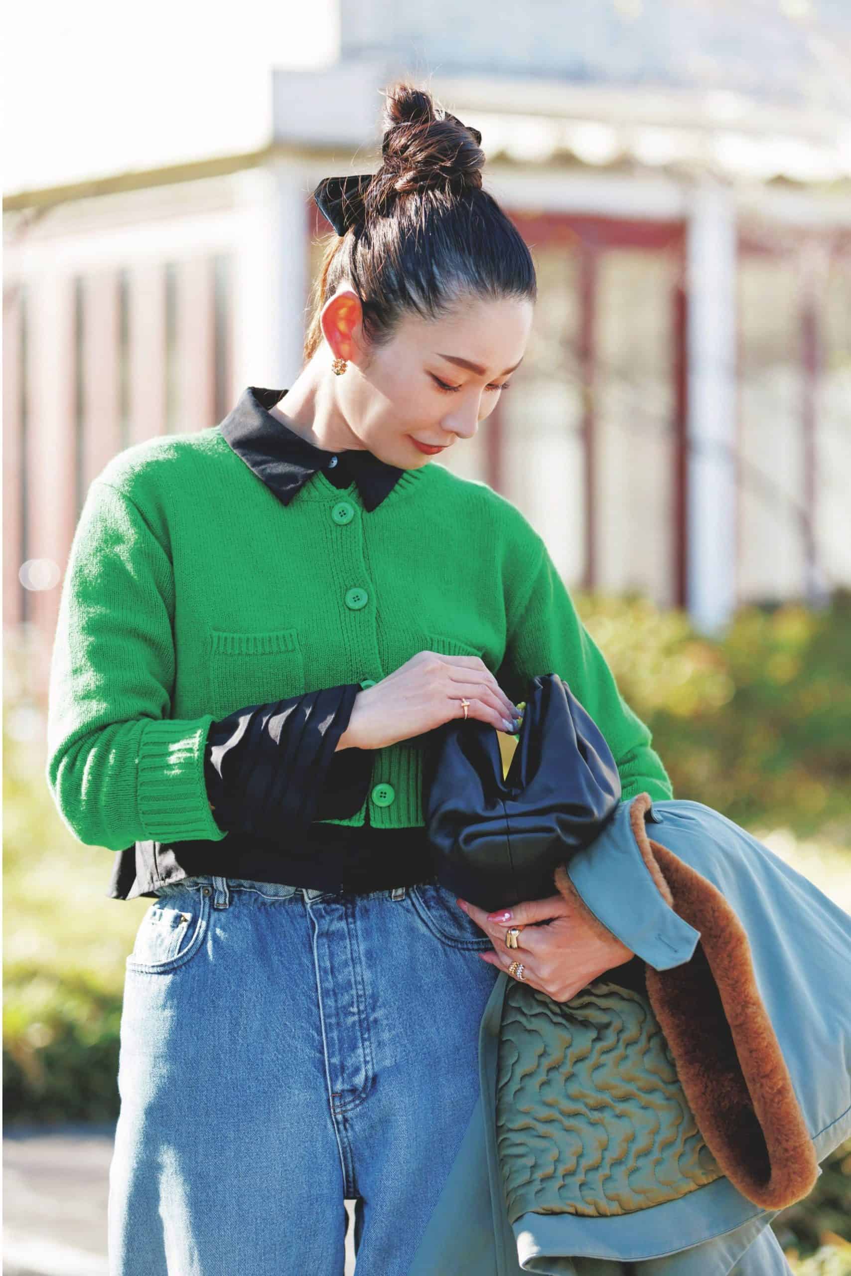 全身ブラックには、差し色にチョコブラウンを。黒に近いダークカラーならコーデにフィットしつつ、女性らしい柔らかさを作れます。軽量感のあるサテン素材は、春らしい爽快な着こなしに最適。