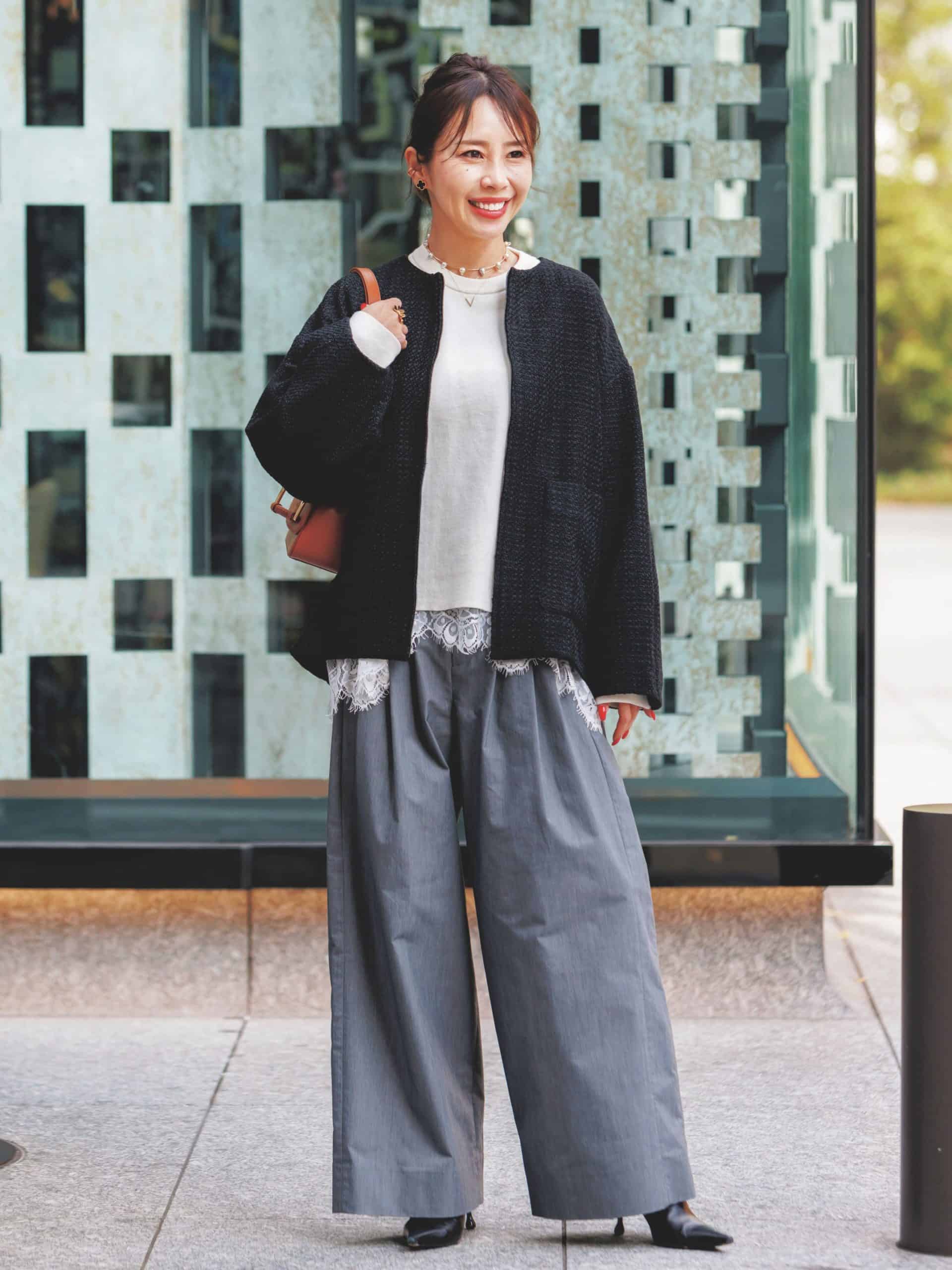 黒パンツに重ねるだけ。40代の地味コーデが垢抜ける【レイヤードアイテム】3選