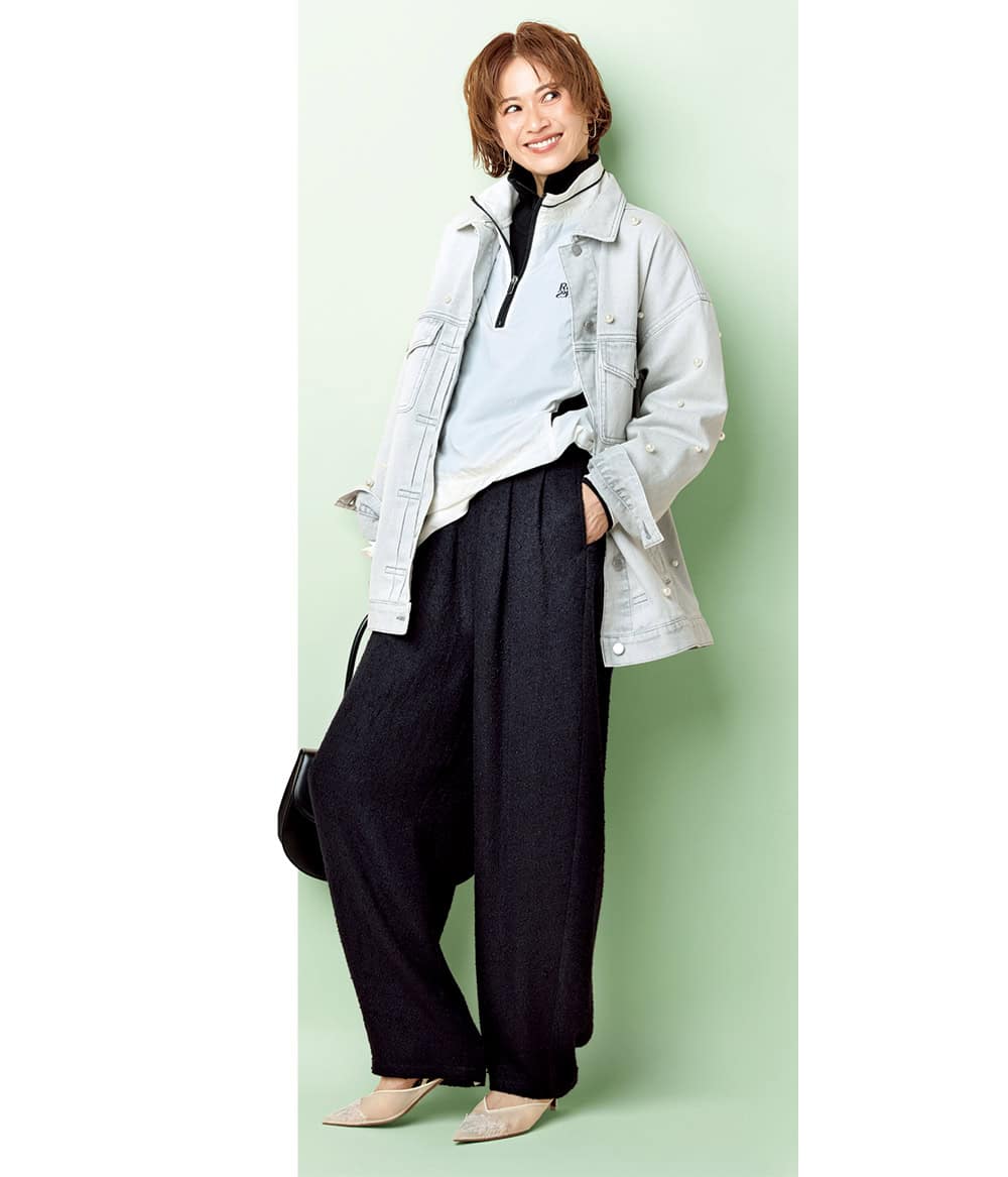 パール付きデニムジャケット¥27,500(アルページュ ストーリー)シアーブルゾン¥17,930(メゾンスペシャル 青山店)ハーフジップスウェット¥27,500(サードマガジン)パンツ¥17,820(ホワイト)バッグ¥78,100 (メゾンヴァジック/ヴァジックジャパン)シューズ¥140,800(ネオス/ザ・ウォール ショールーム)ピアス¥61,600(バージュエリー/エルディスト ショールーム)