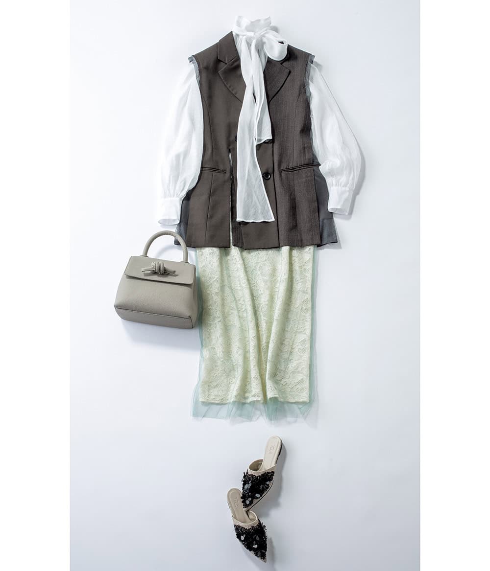 ジレ¥27,500(メゾンスペシャル 青山店)ブラウス¥11,900(GapStudio)スカート¥39,600(マージ/エスアンドティ)バッグ¥56,100 (ヴァジック/ヴァジックジャパン)シューズ¥43,560(テラ/ティースクエア プレスルーム)