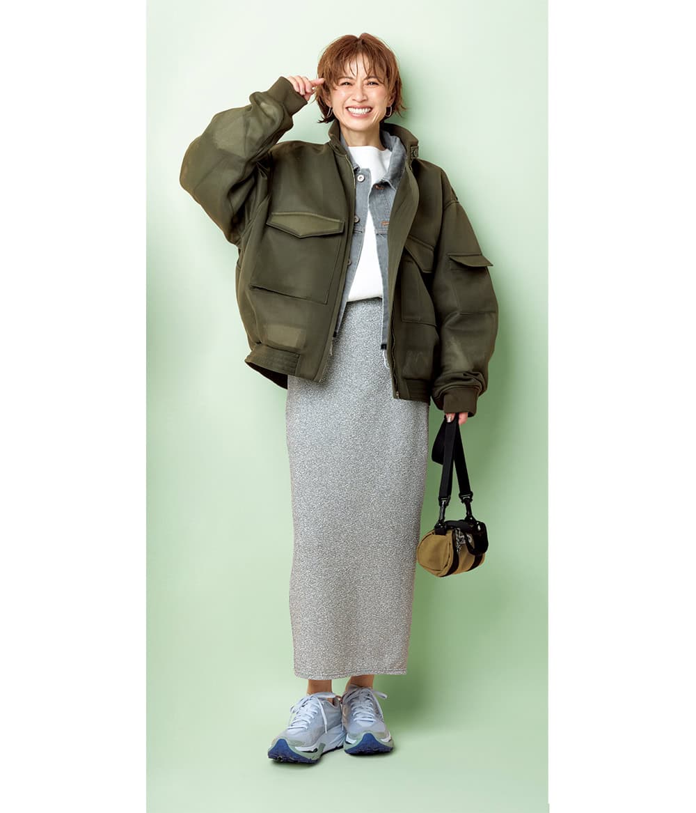 シアーボンバージャケット¥68,200(ハイク/ボウルズ)デニムジャケット¥52,800(サクラ/インターリブ)スウェットトップス¥31,900(エイトン 青山)スカート¥20,900(シー/エスストア)バッグ¥3,080(アウトドアプロダクツ/アウトドアプロダクツ カスタマーセンター)シューズ¥27,500(ホカ®/デッカーズ ジャパン)ピアス¥61,600(バージュエリー/エルディストショールーム)