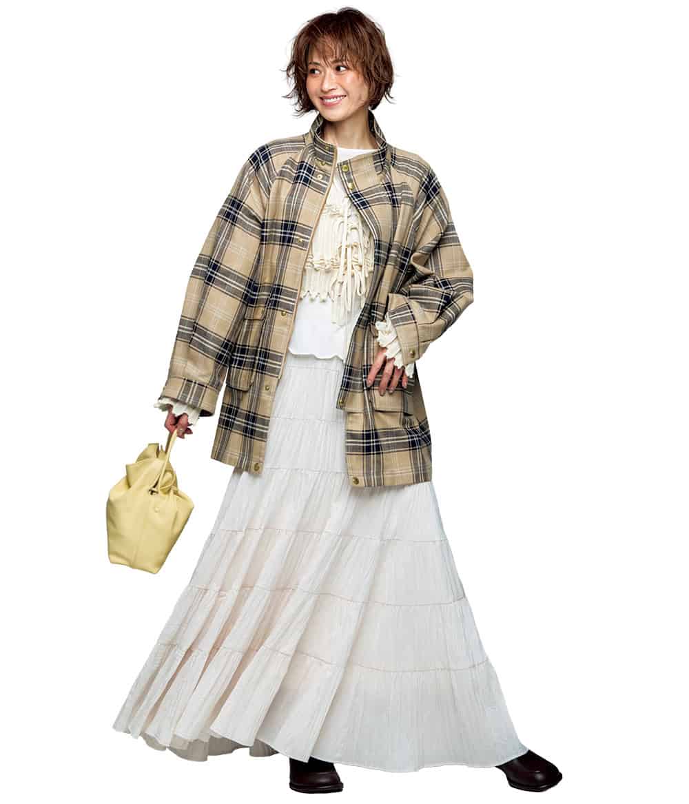 チェックブルゾン¥53,900(トラディショナル ウェザーウェア/トラディショナル ウェザーウェア 渋谷店)カーディガン¥39,600(オープン セサミ クラブ)カットソー¥16,500(エス/sense)スカート¥29,700(カデュネ)バッグ¥45,100(ヴァジック/ヴァジックジャパン)シューズ¥37,000(シーセイ/アイネックス)