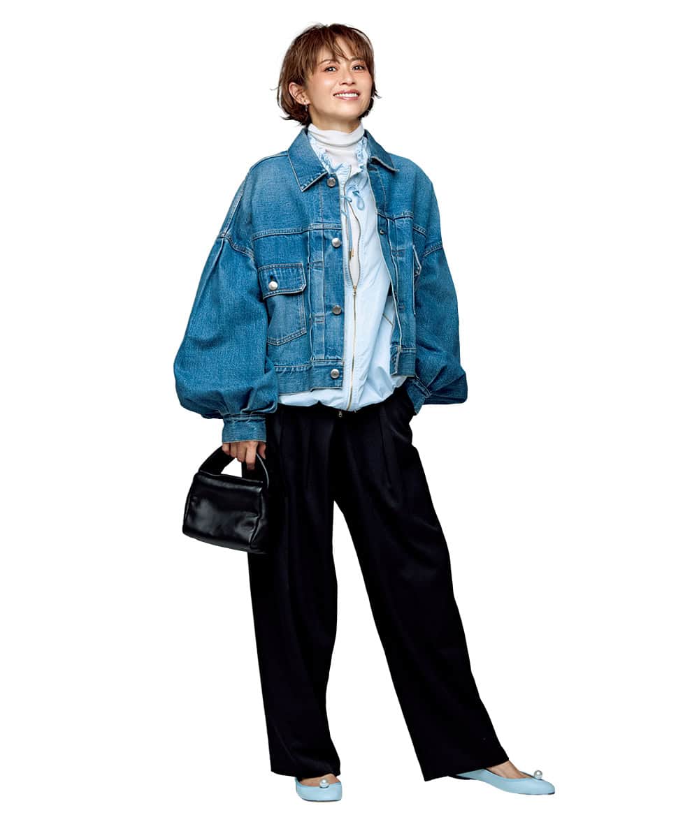 デニムジャケット¥52,800(ハイク/ボウルズ)シアーブルゾン¥96,800(タトラス/タトラス カスタマーセンター)ニット¥11,000(ノーク)パンツ¥26,400(カデュネ プレスルーム)バッグ¥35,200(バケット バゲージ/アイネックス)シューズ¥41,800(ピッピシック/ベイジュ)ピアス(大)¥25,300(中)¥20,900(ともにマユ/マユ ショールーム)
