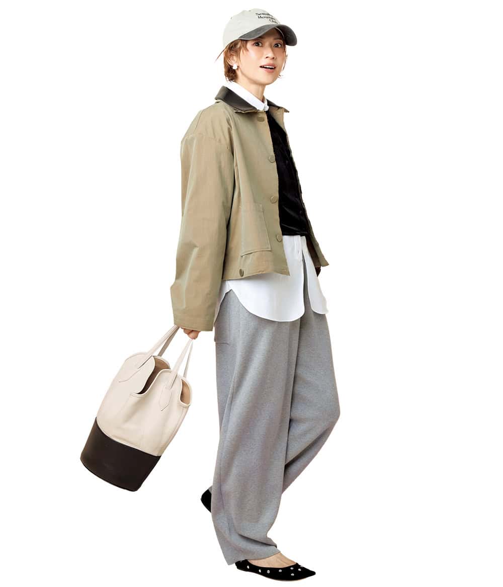 ジャケット¥49,500(サードマガジン)カーディガン¥8,910(ミラ オーウェン/ミラ オーウェン ルミネ新宿2店)シャツ¥51,700(マディソンブルー)パンツ¥53,900 (エイトン青山)バッグ¥181,500 (J&M デヴィッドソン/J&M デヴィッドソン カスタマーセンター)シューズ¥41,800 (ピッピシック/ベイジュ)キャップ¥7,700(シー/エスストア)ピアス¥29,700(片耳価格)(マユ/マユ ショールーム)
