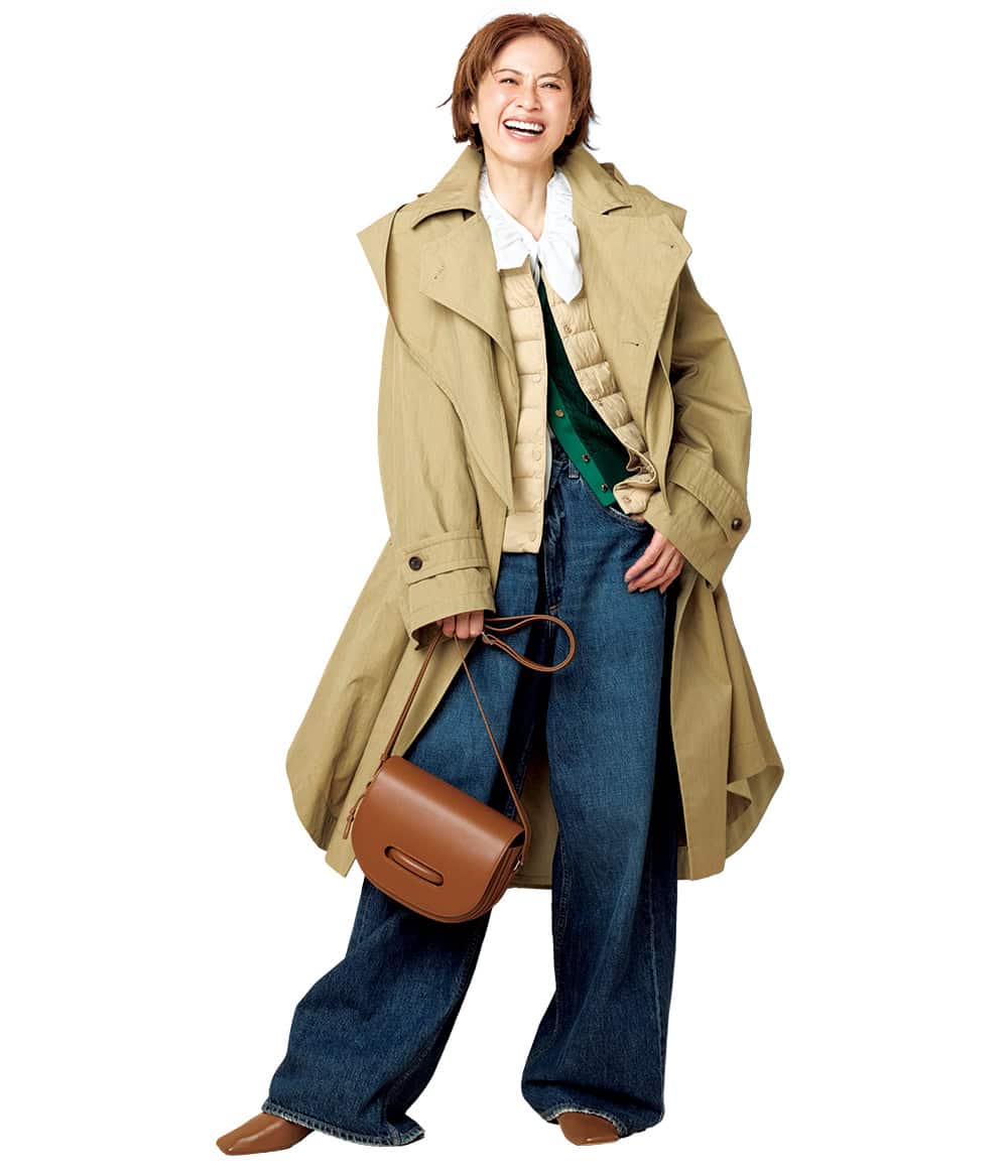 フードカラー付きコート¥132,000(デパリエ 伊勢丹新宿店)ダウンベスト¥4,990(ユニクロ)カーディガン¥20,900(アルページュ ストーリー)ブラウス¥25,300(ビリティス・ディセッタン/ビリティス)デニム¥53,900(エー・ゴールド・イー/シチズンズ・オブ・ヒューマニティ)バッグ¥95,700(メゾンヴァジック/ヴァジックジャパン)シューズ¥37,400(ピッピシック/ベイジュ)イヤカフ¥16,500(マユ/マユ ショールーム)
