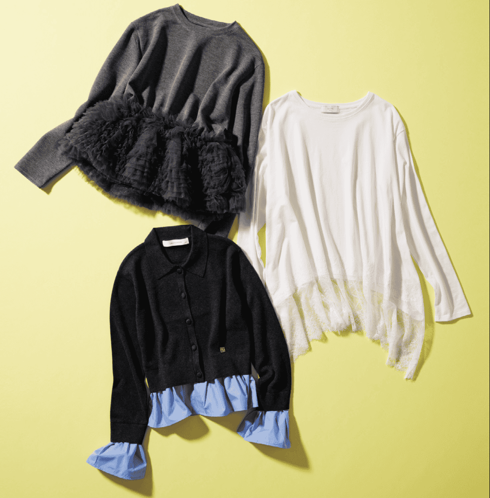 A 華やかな裾のチュールがいつものボトムスを華やかに更新。¥11,000(BLANC) B 1枚ではもちろん、春ニットをレイヤードしたり、ジャケットのインナーに合わせるだけで旬のコーディネートに。¥8,800(SLOBE IÉNA) C レイヤード風の裾は取り外しが可能。ペプラムシルエットでスタイルアップも叶える。¥14,300(ラグナムーン)