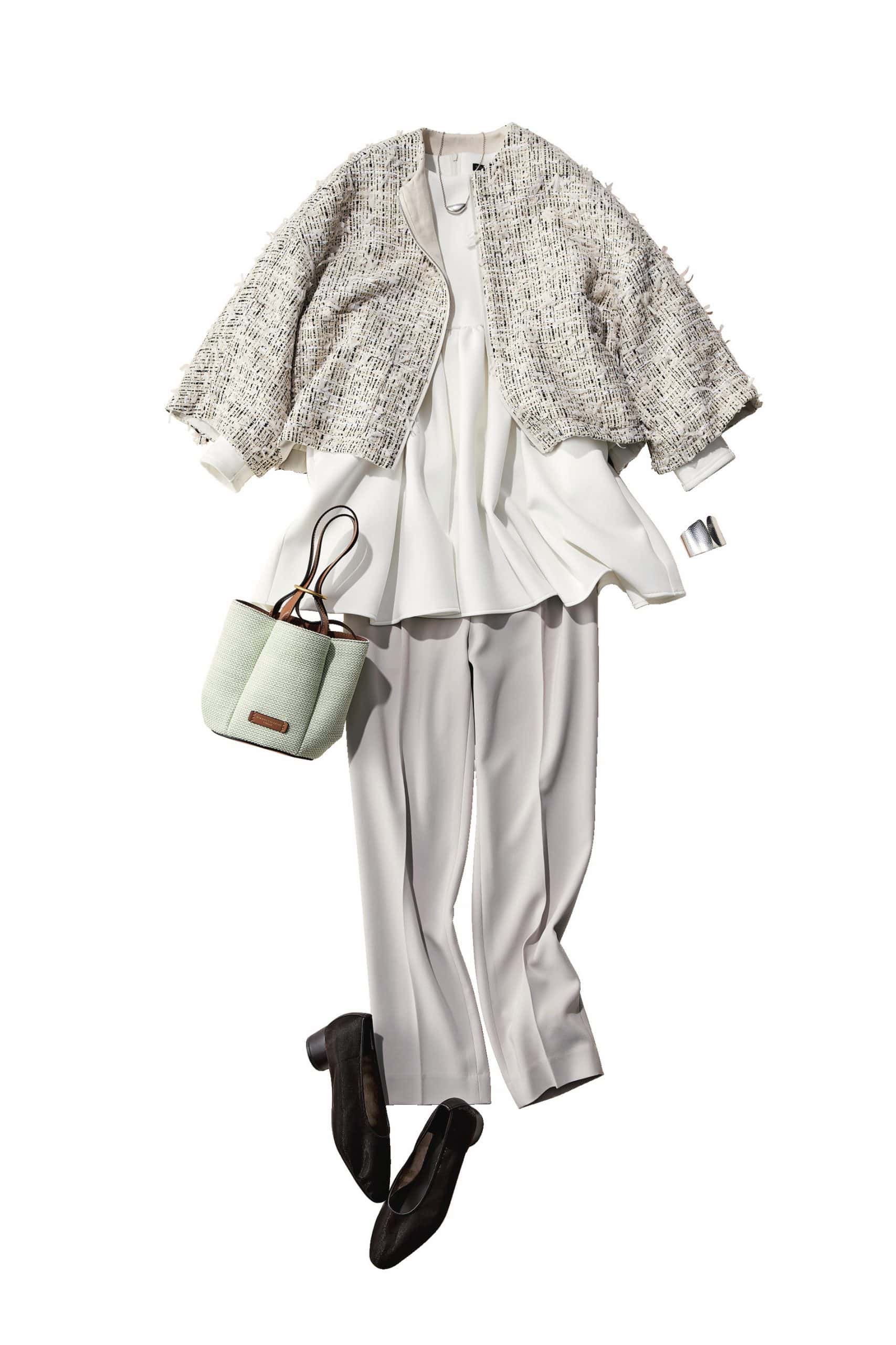 ツイードジャケット¥82,500(デパリエ/デパリエ 伊勢丹新宿店)ペプラムトップス¥23,100(ツル バイ マリコ オイカワ)パンツ¥12,000(PLST)バッグ¥42,900(ジャンニ キアリーニ/ジャンニ キアリーニ銀座店)メッシュパンプス¥13,200(ル タロン/ル タロン 有楽町マルイ店)ネックレス¥63,800(カミーユスロ/オブリオ)バングル¥7,830(アビステ)