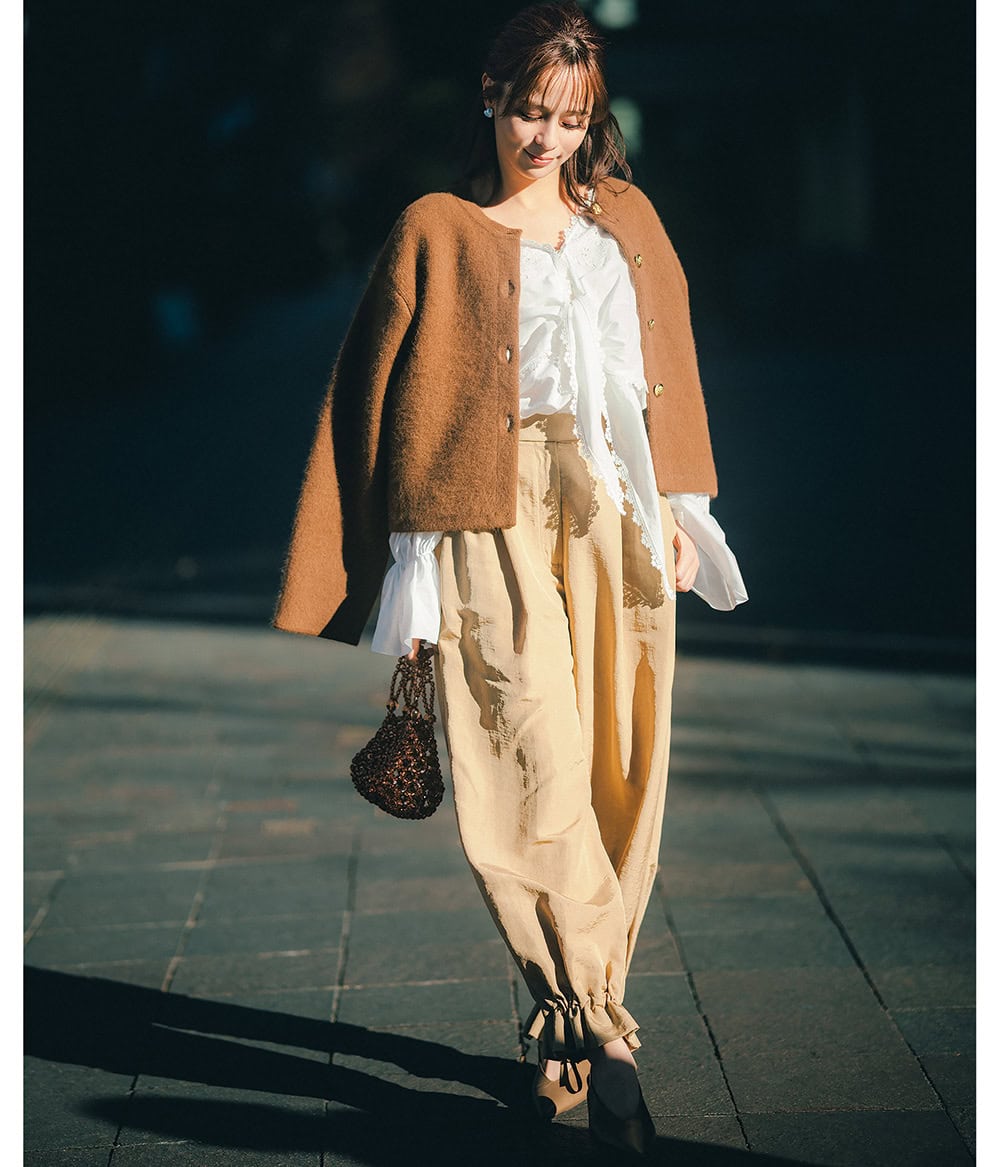 パンツ¥41,800(フミエタナカ/ドール)カーディガン¥28,600(アルページュ ストーリー)ブラウス¥39,600(サロン アダム エ ロペ)バッグ¥24,200(ヴィスク/エスアンドティ)シューズ¥35,000(バナナ・リパブリック)ピアス各¥29,700(マユ/マユ ショールーム)