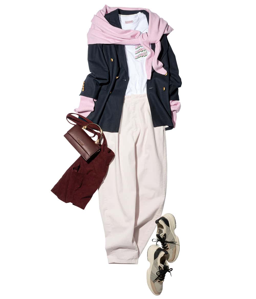 ジャケット¥97,900(ニアー ニッポン/ニアー)Tシャツ¥13,200〈BISOUS SKATEBOARDS〉パンツ¥44,000〈THIRD MAGAZINE〉(ともにTHIRD MAGAZINE)ニットストール¥4,990アームウォーマー¥3,990トートバッグ¥3,990(すべてアンフィーロ)バッグ¥9,900(チャールズ&キース/チャールズ&キース ジャパン)スニーカー¥15,990(ステッピ)