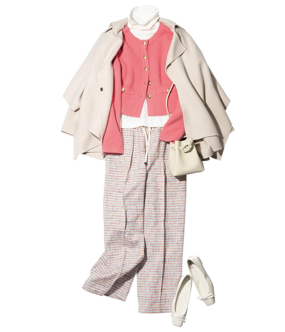 カーディガン¥27,500(マイストラーダ/マイストラーダ プレスルーム)コート¥66,000(カデュネ/カデュネ プレスルーム)タートルネックカットソー¥14,300(スローン/ザ スローン ショップ 新静岡セノバ店)ツイードパンツ¥72,600(ebure/リトルリーグ インク)バッグ¥44,000(ヴァジック/ヴァジックジャパン)パンプス¥29,700(ツル バイ マリコ オイカワ)