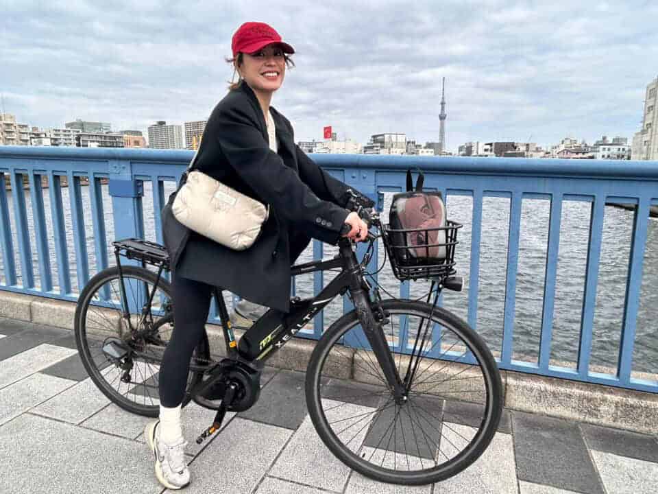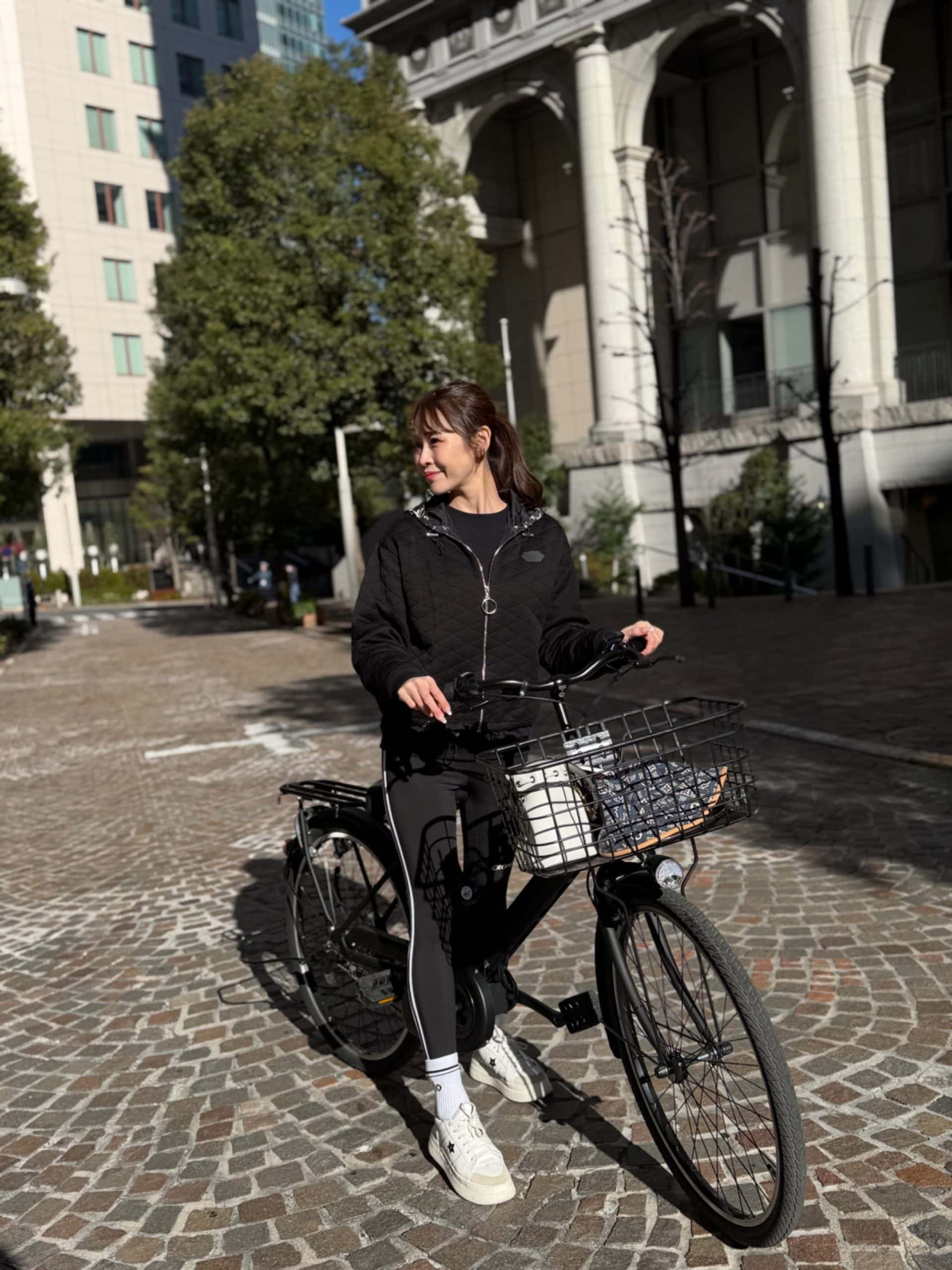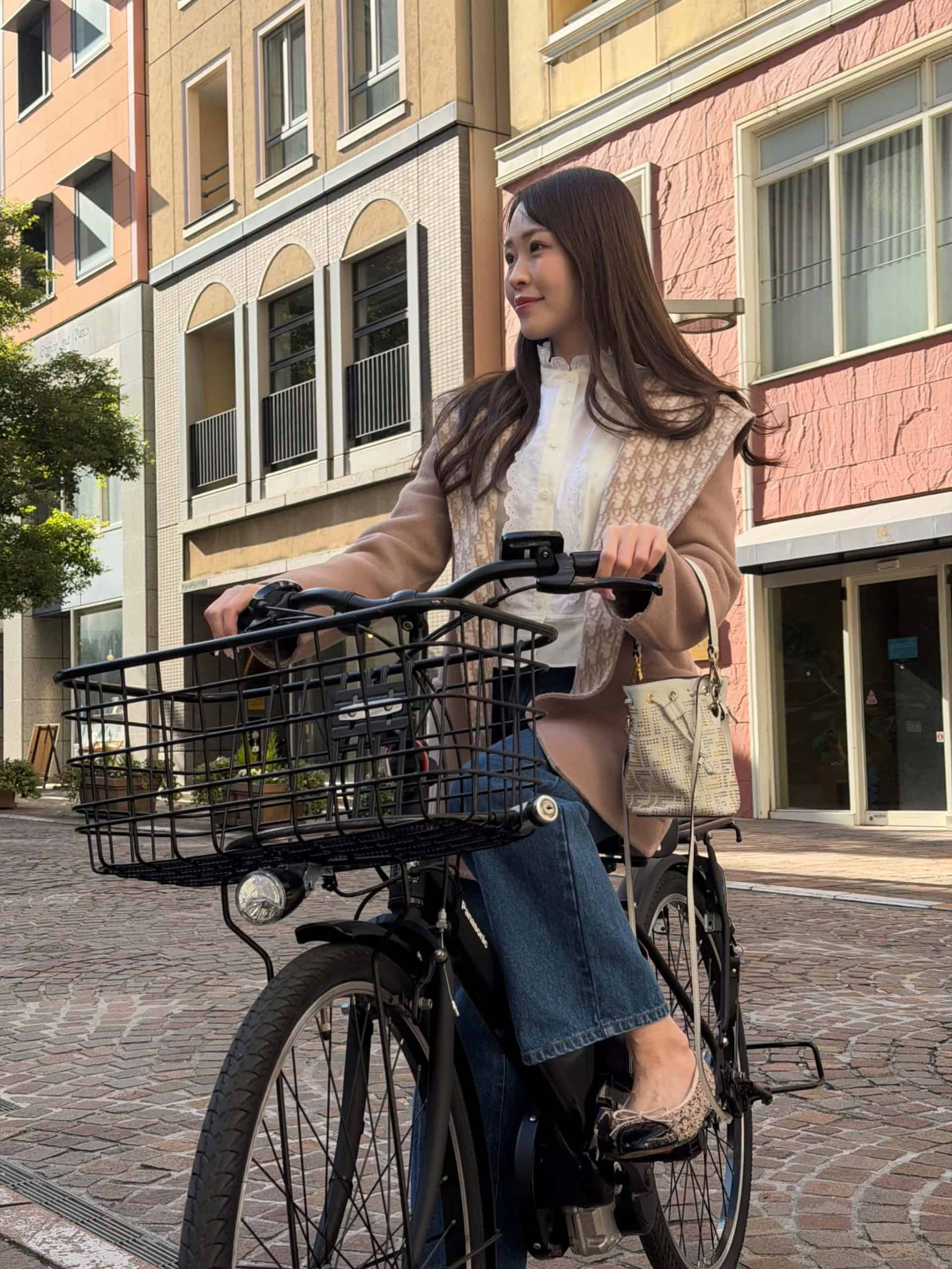 パナソニックのEZシリーズ艶消しマットブラックに、前カゴとボトルホルダーをカスタムしています。ヨガ帰りにそのまま近所へお買い物にも行けるように、トップスはゆったり、ボトムは暖かい裏起毛レギンスでこなれ感のある楽ちんコーデにしてみました。荷物も乗せられて実用性を確保しつつ、コンパクトで乗りやすい、毎日の生活に欠かせない私の相棒です!