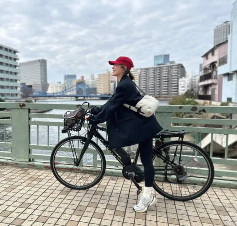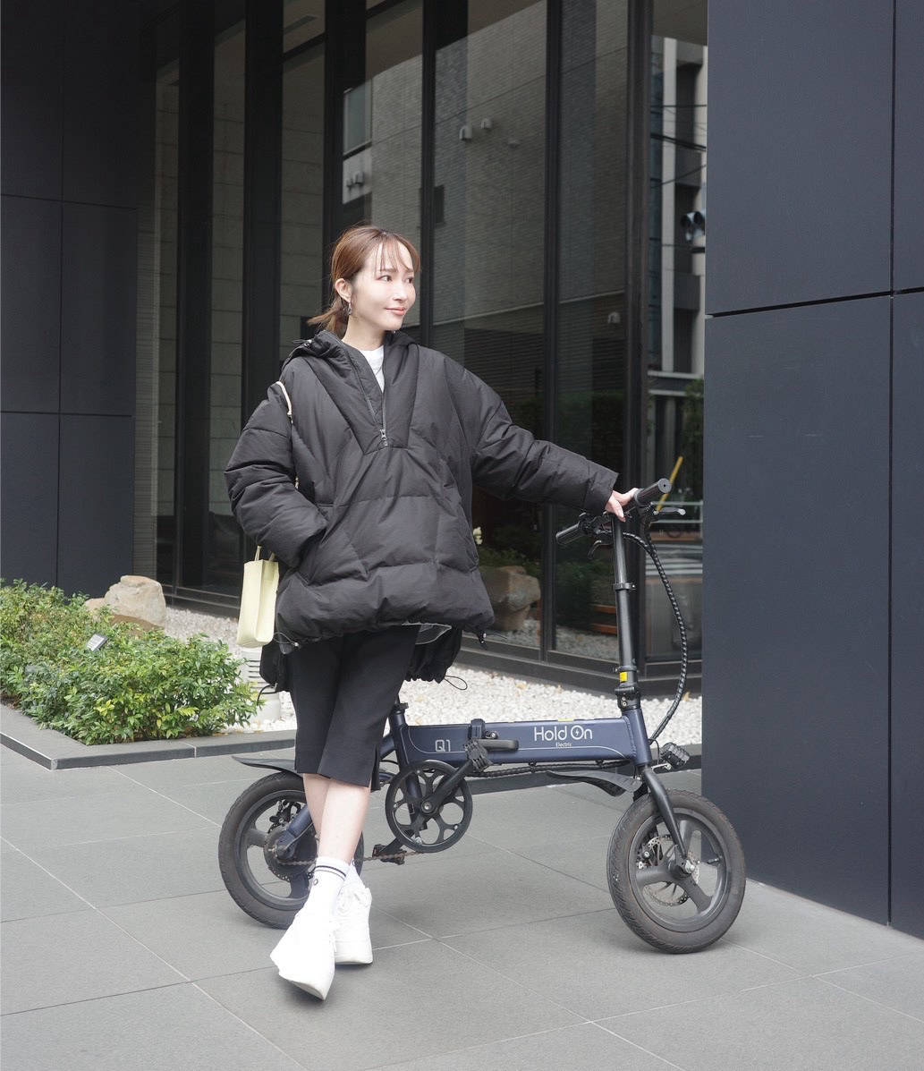 家族でシェアしている折りたたみ自転車は、ピラティスや近所の買い出しにさっと乗れる手軽さが魅力。ママチャリと比べて軽く、駐輪場でも扱いやすいので日常使いにちょうどいい存在です。コーデは動きやすさを重視したブラックのワントーンでまとめつつ、aloのソックスやバイカーパンツでトレンド感をプラス。自転車に乗る時は、シンプルだけど今っぽい、スタイリッシュなスポーティスタイルを意識しています。