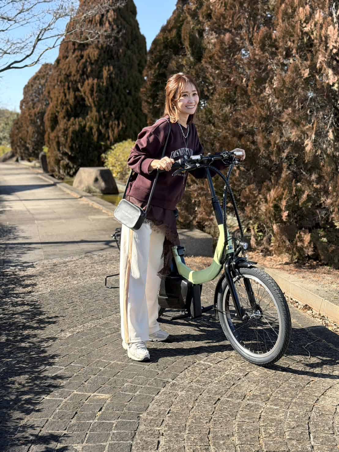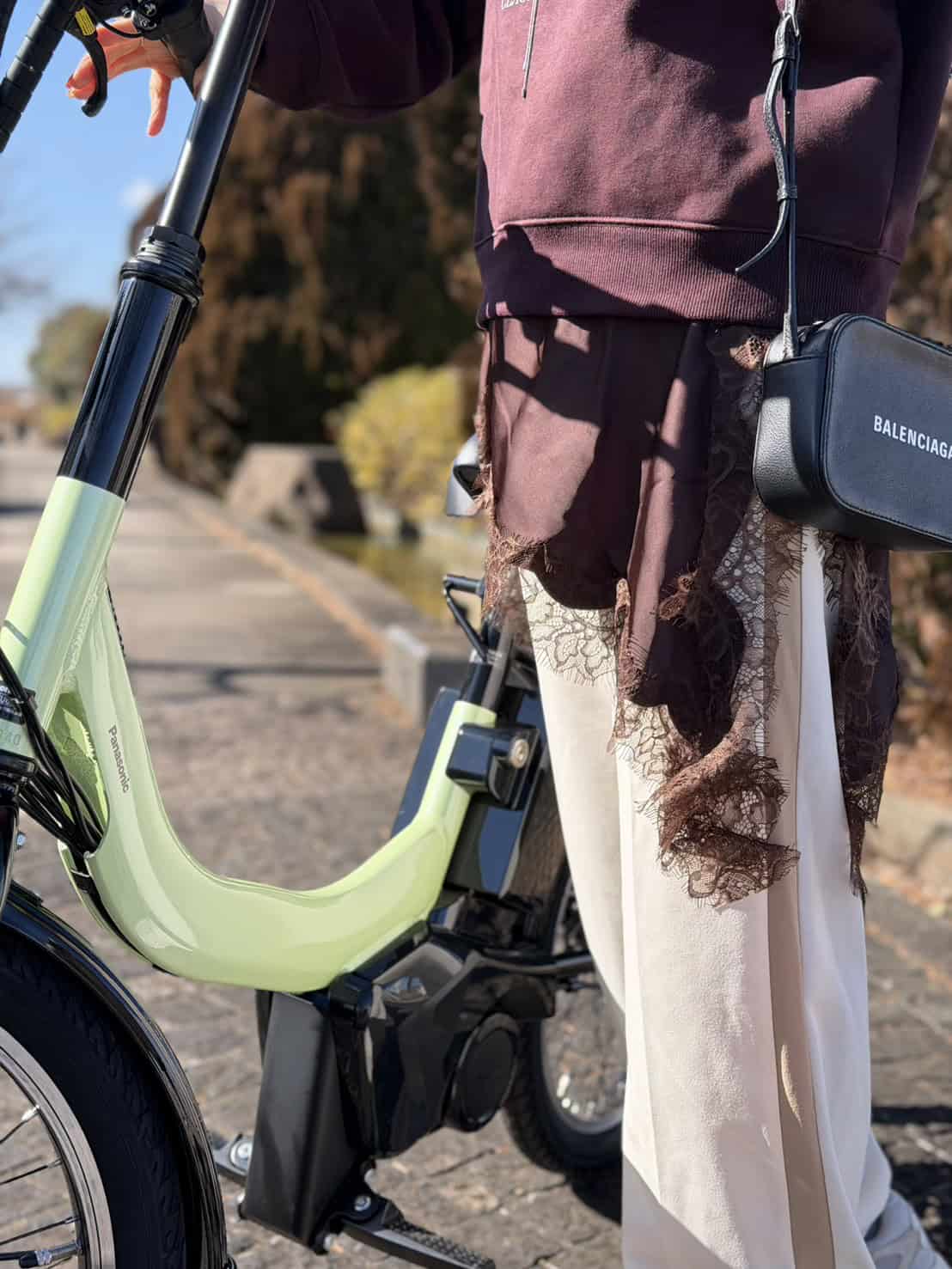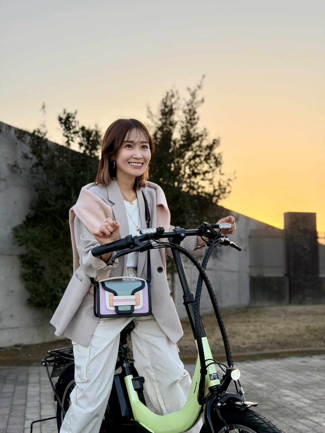 コンパクトながら、しっかりアシストしてくれるので通勤で駅まで、休みの日も近所にと、ほぼ毎日乗っています。通勤スタイルはスウェットパンツにジャケットとミュールを合わせ、抜け感を意識。ホワイトの素材違いで奥行きを出しつつ、小物は黒でキリッと引き締め、ジュエリーで全体のバランスを調整。スクエアバッグは、自転車に乗る時は斜めがけ、綺麗めにカッコよく持ちたいときは短く持って使い分けています。