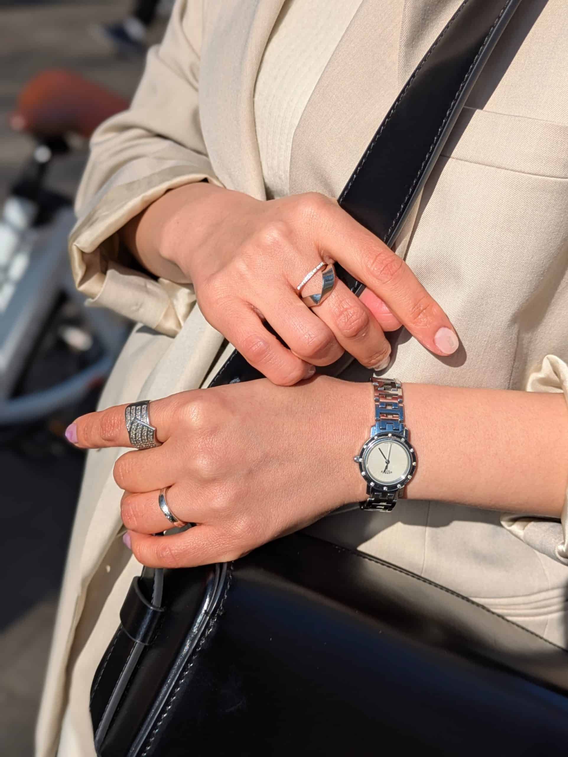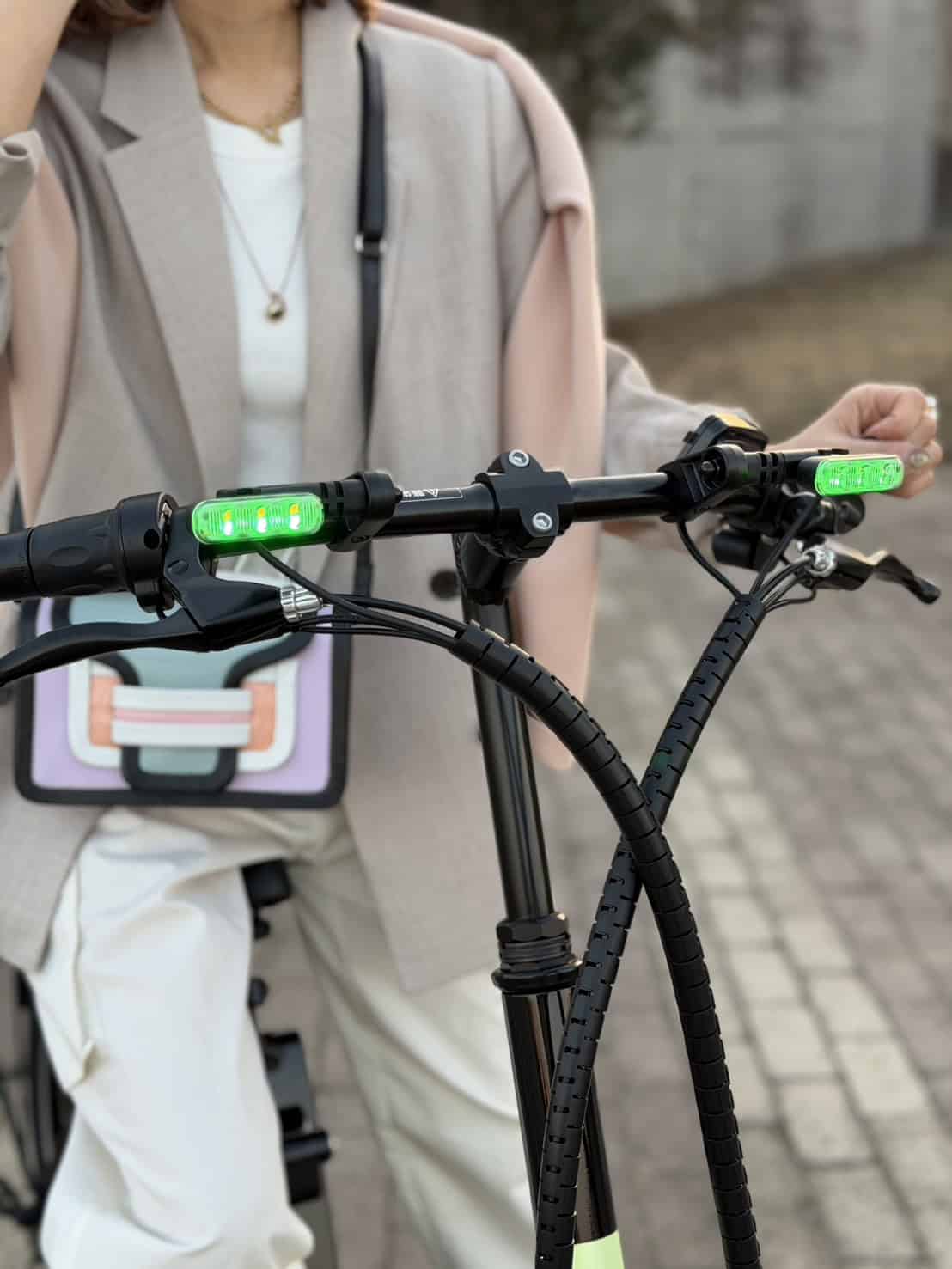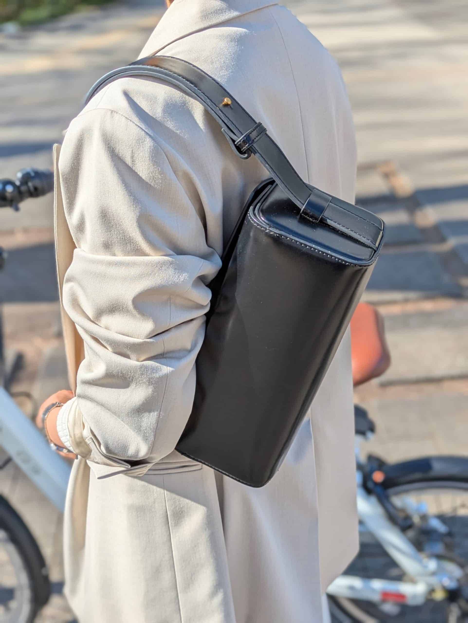コンパクトながら、しっかりアシストしてくれるので通勤で駅まで、休みの日も近所にと、ほぼ毎日乗っています。通勤スタイルはスウェットパンツにジャケットとミュールを合わせ、抜け感を意識。ホワイトの素材違いで奥行きを出しつつ、小物は黒でキリッと引き締め、ジュエリーで全体のバランスを調整。スクエアバッグは、自転車に乗る時は斜めがけ、綺麗めにカッコよく持ちたいときは短く持って使い分けています。