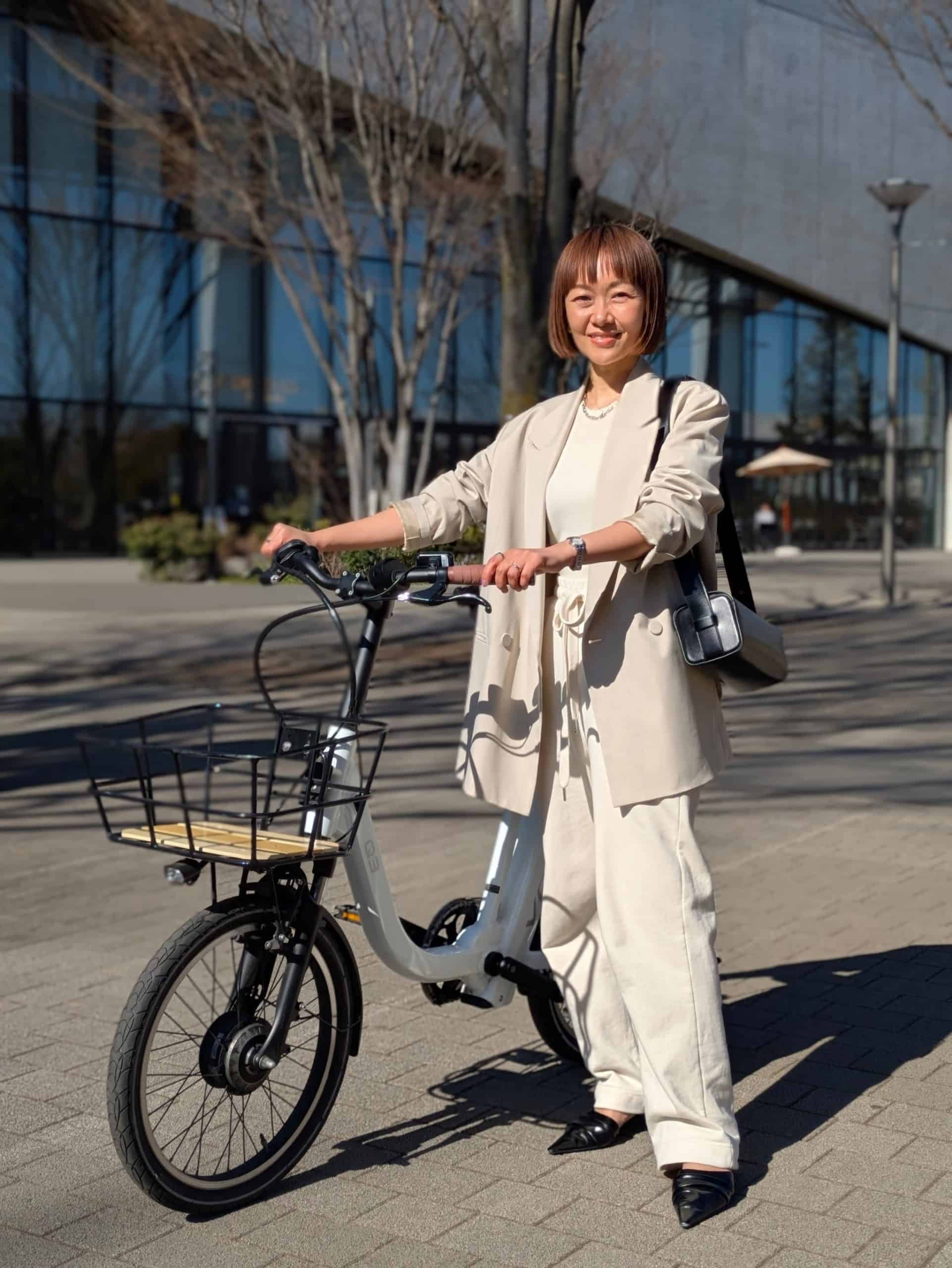 <漕がずに進む最新自転車にはきちんと感と春らしさで大人の余裕を>