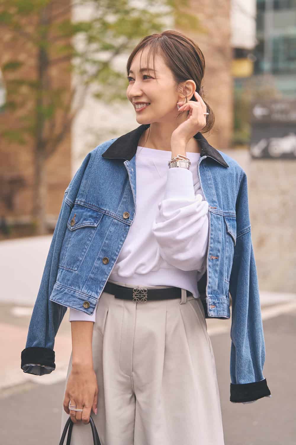 「襟元と袖口がブラックの異素材になったデニムジャケットは、短丈なのでパンツでもスカートでも合わせやすいところがお気に入り。今回は落ち感のあるワイドパンツを合わせて品よく、また白のスウェットとメッシュフラットシューズで今年らしいバランスに。小物は黒で引き締めて、大人のキレイめカジュアルに仕上げました。」