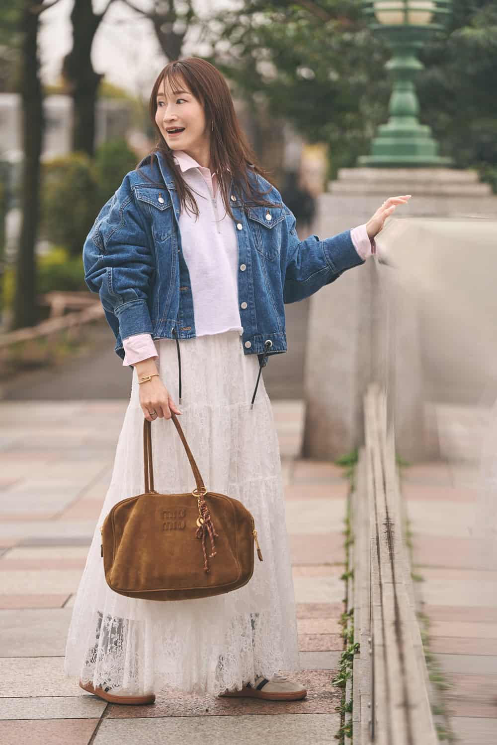 「今季購入したデニムジャケットは、肩周りにゆとりのあるドルマンスリーブのデザイン。裾のレザーコードを絞るとフォルムが変わるのも魅力です。今回は白レーススカートを合わせて、甘くなりすぎないようデニムジャケットでカジュアルダウン。キャメルのバッグを合わせて、淡いトーンのコーデを程よく引き締めました」