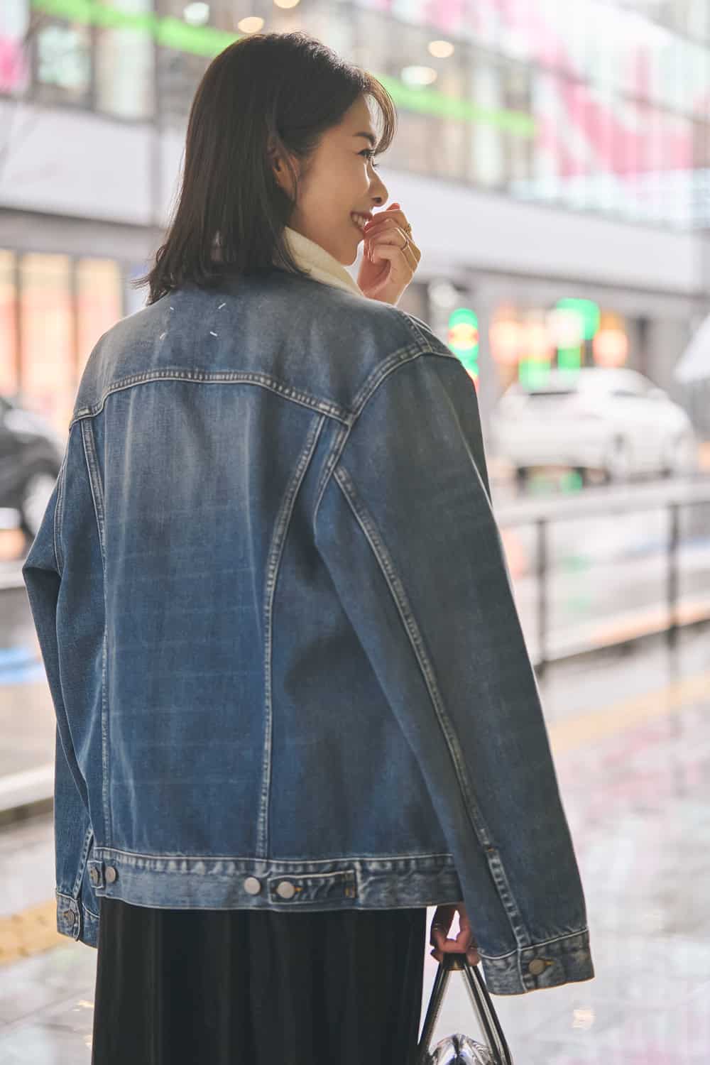 「夫のデニムジャケットであることもあり、オーバーサイズでカジュアルになってしまいがち。今回は大人モードに仕上げたかったので、他はモノトーンでまとめました。ラミネート加工のスカートとboutique310のビニールバッグの光沢感で遊び心をプラス。ドラマチックなスカートをタビミュールで引き締めて、甘さにブレーキをかけたバランスを意識しました。」