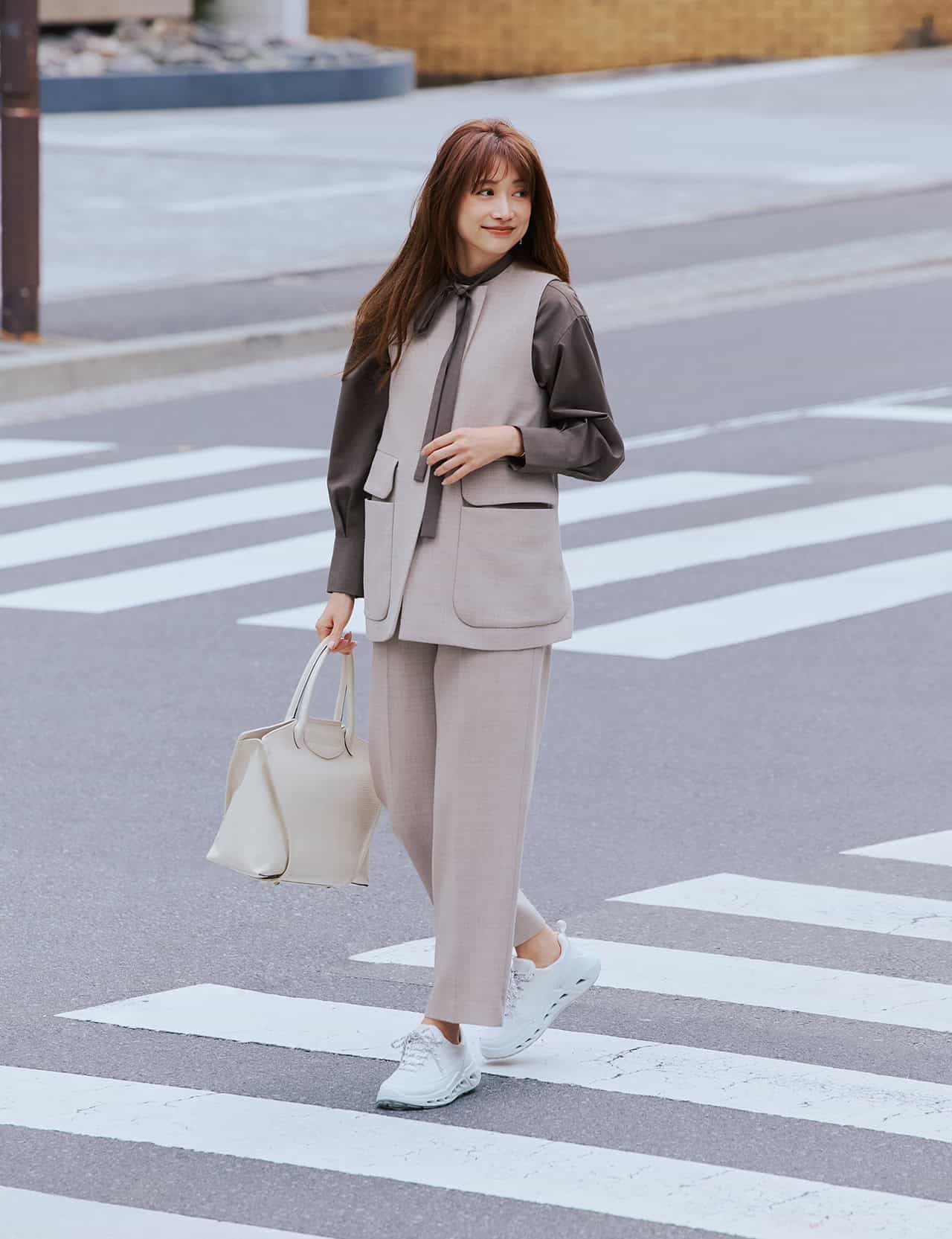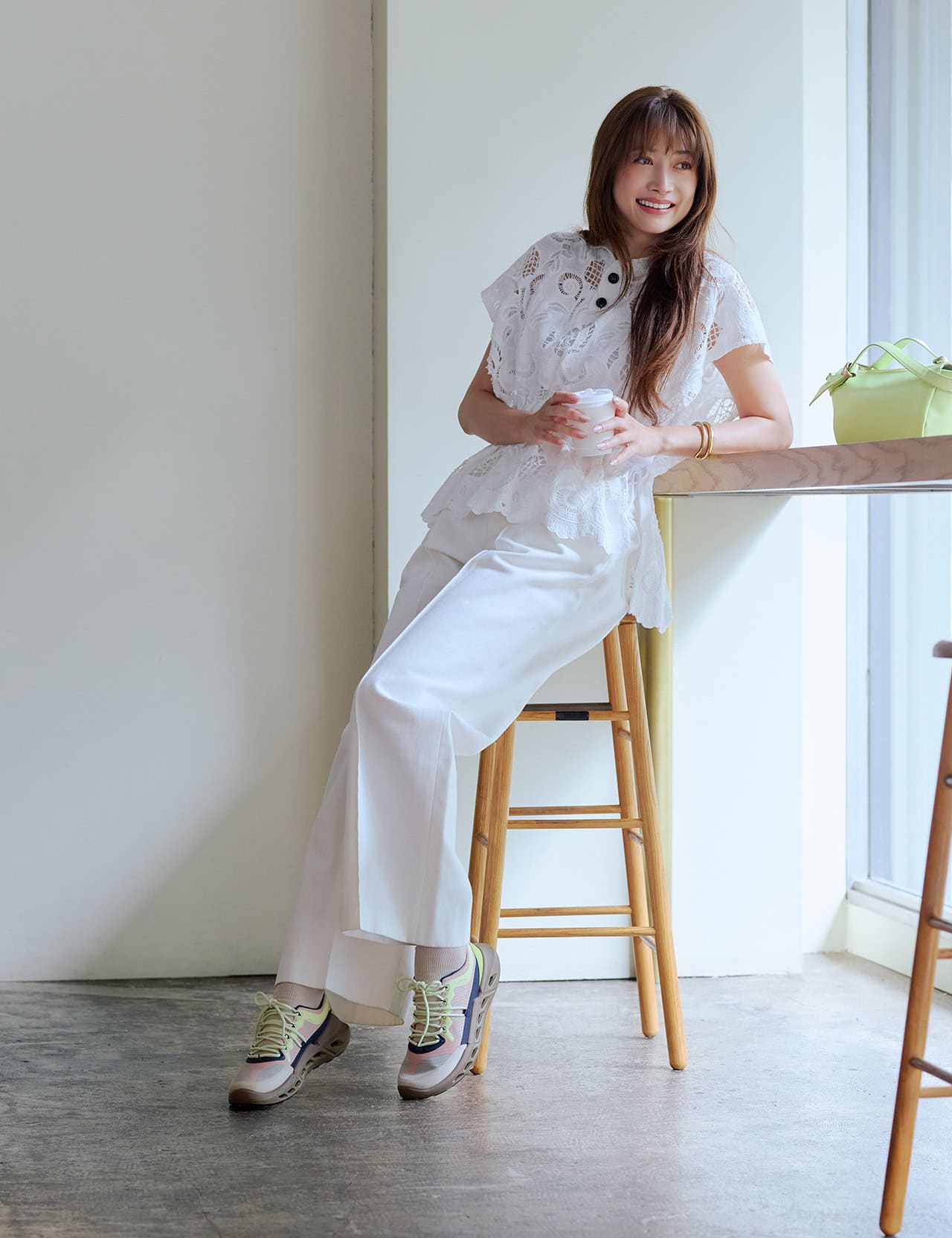 高級感のあるレザーですが、驚くほどの柔らかさと軽さで歩きやすく歩き回る日には欠かせないアイテムになりそう。白スニーカーは、カジュアルにも、キレイめにも合わせやすいのでデイリーに活躍しますが、ただ白いのではなく、シューレースにニュアンスがあるのが今っぽくて素敵ですよね。