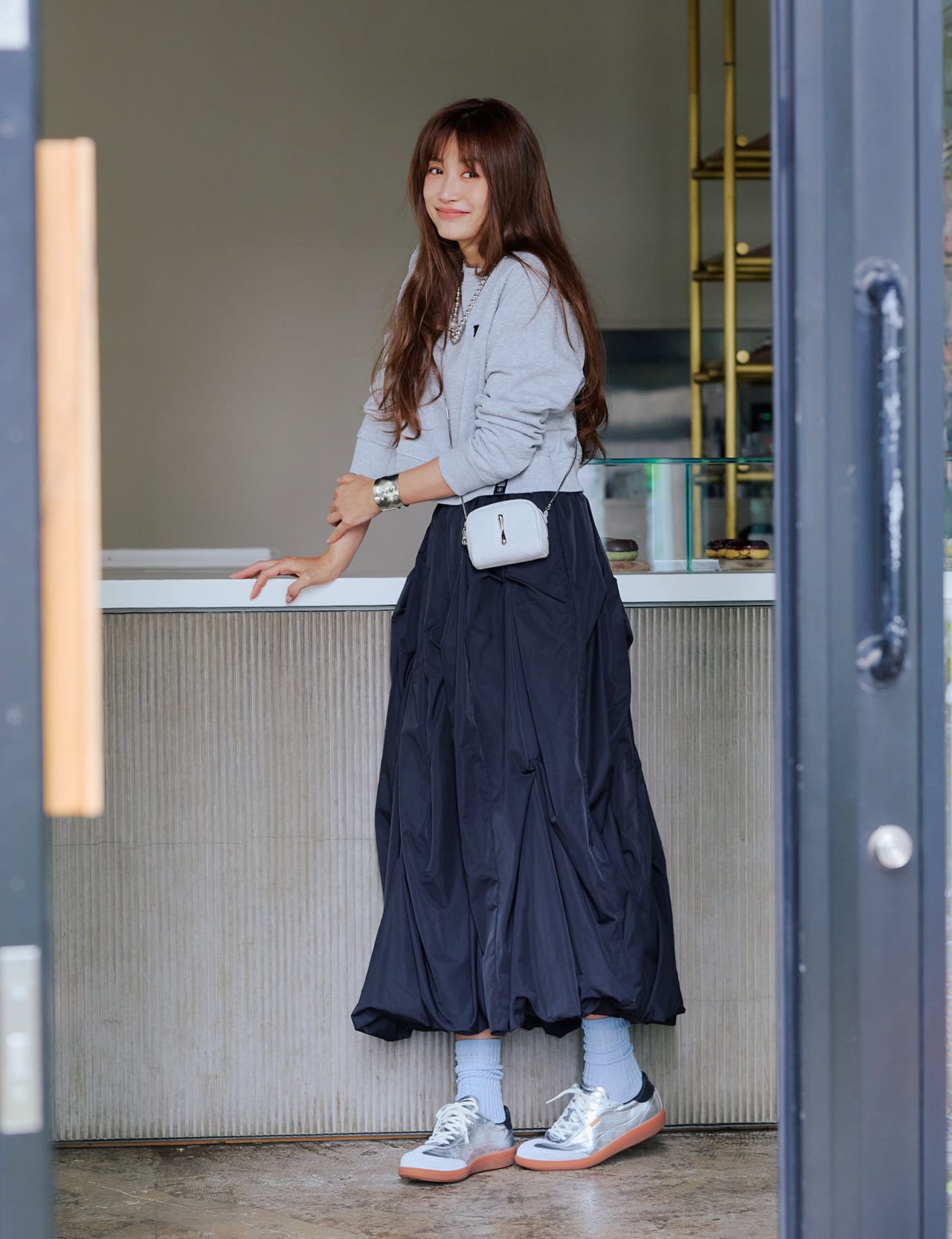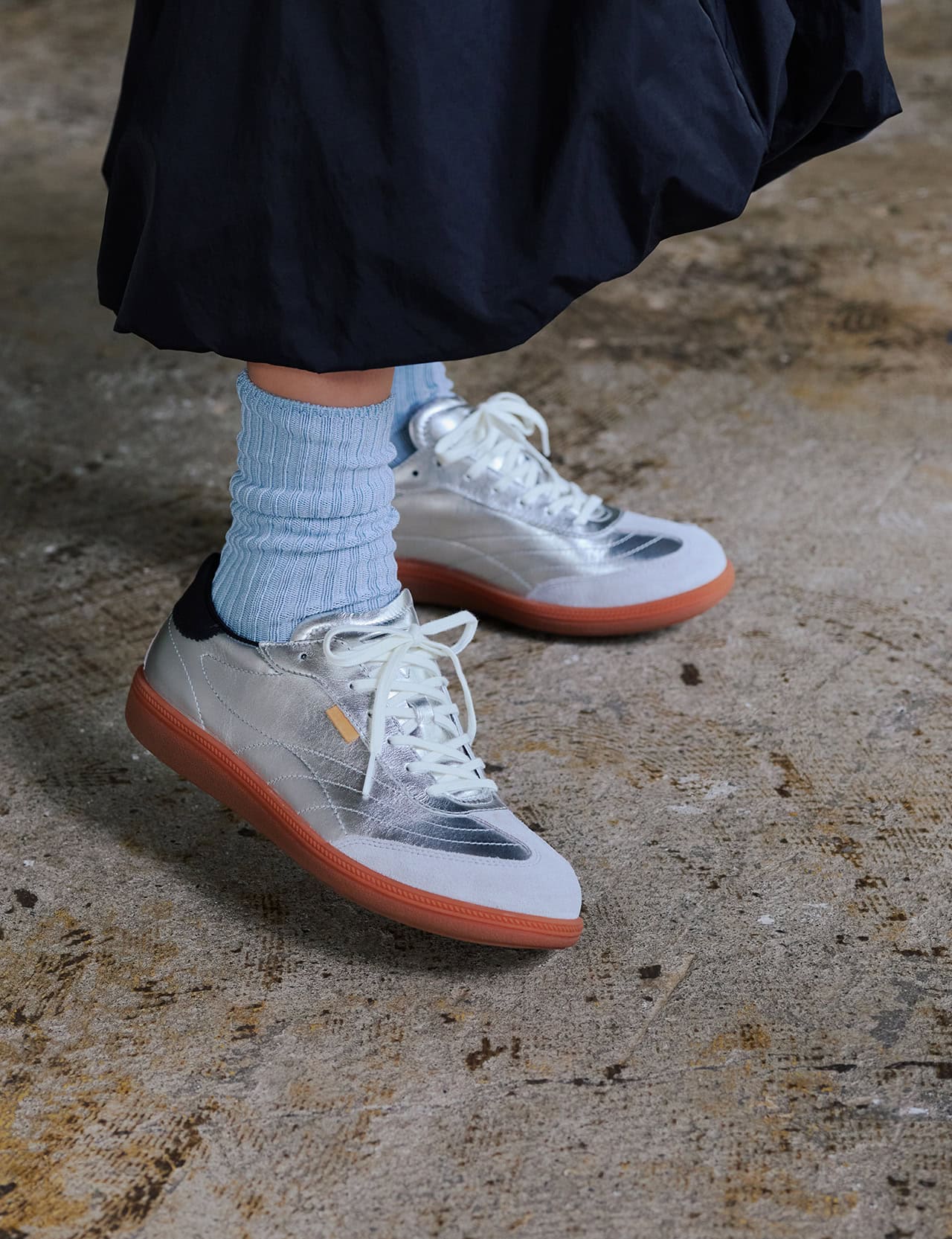 ゴールドほど気張らず、グレーよりも華やか。シルバーは、様々なテイストの服を楽しみたい今の私に、寄り添ってくれる存在です。クラシックなデザインにメタリック素材を掛け合わせた今年らしいミックス感で、ローテクでもほっこり見えないのが魅力。一見底が薄く見えますが快適なクッション性もあり、STORY世代が気負わずカジュアルにトライしたい時に、自然と手が伸びる一足です。