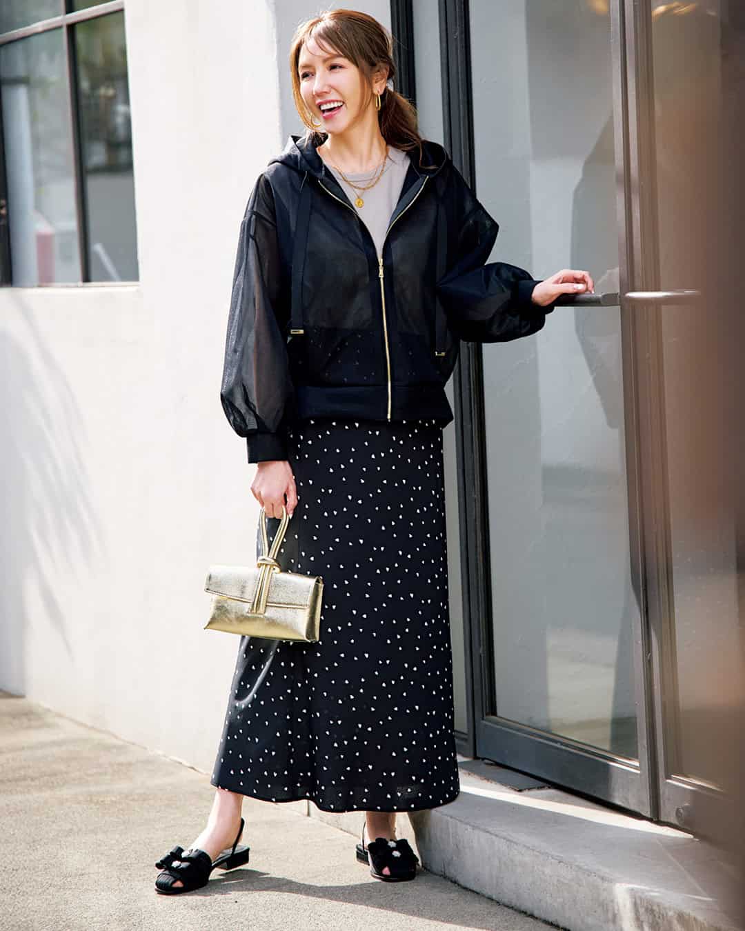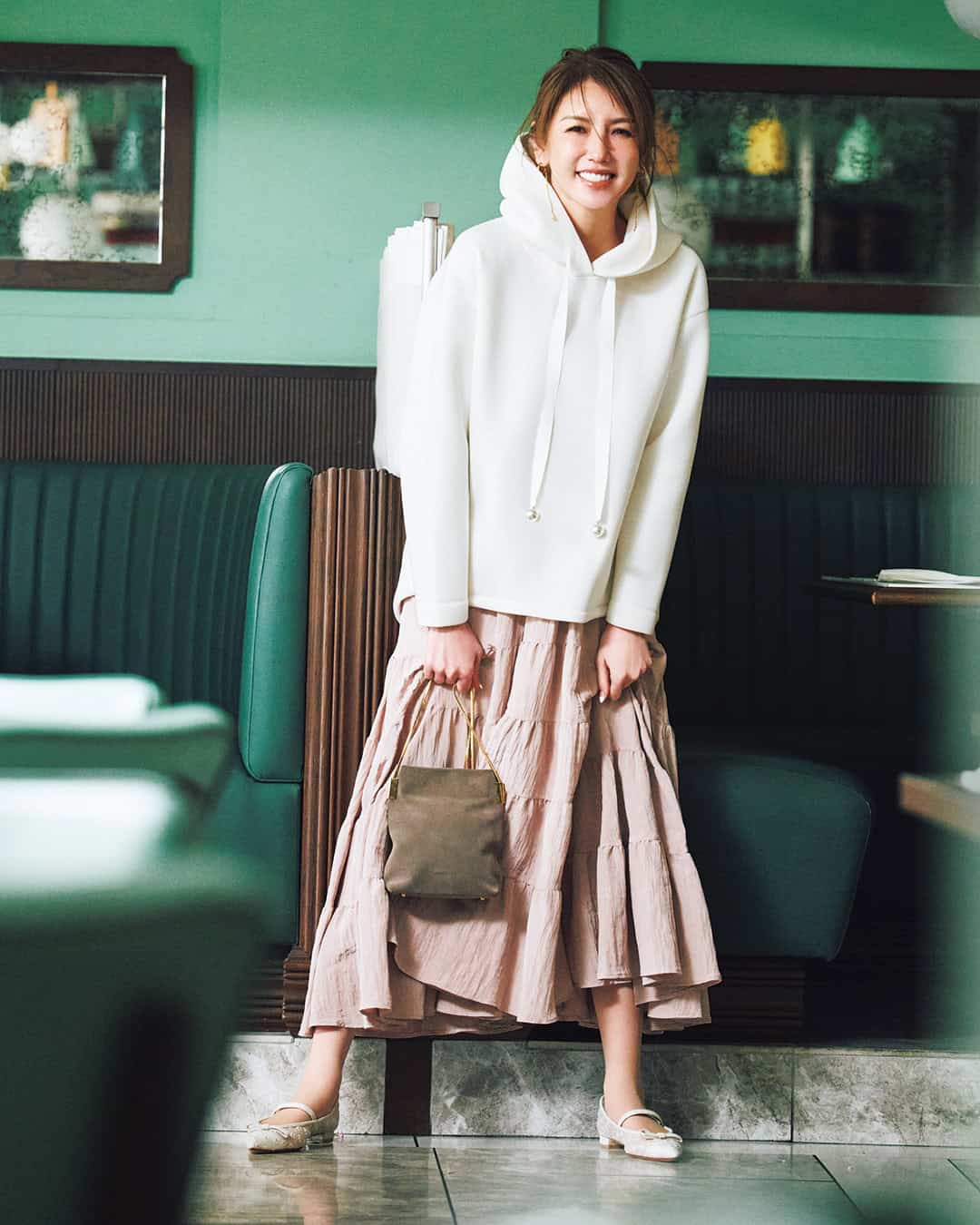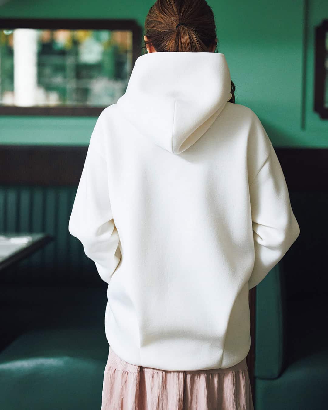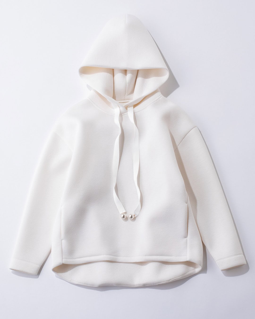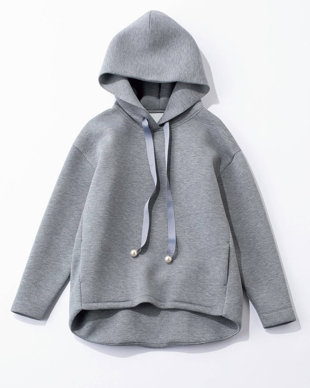 ③スカートと相性抜群!パールがアクセントになる「ボンディングフーディー」