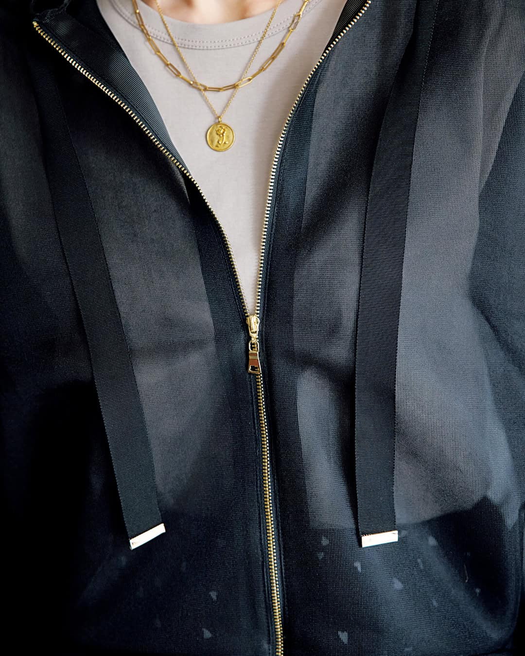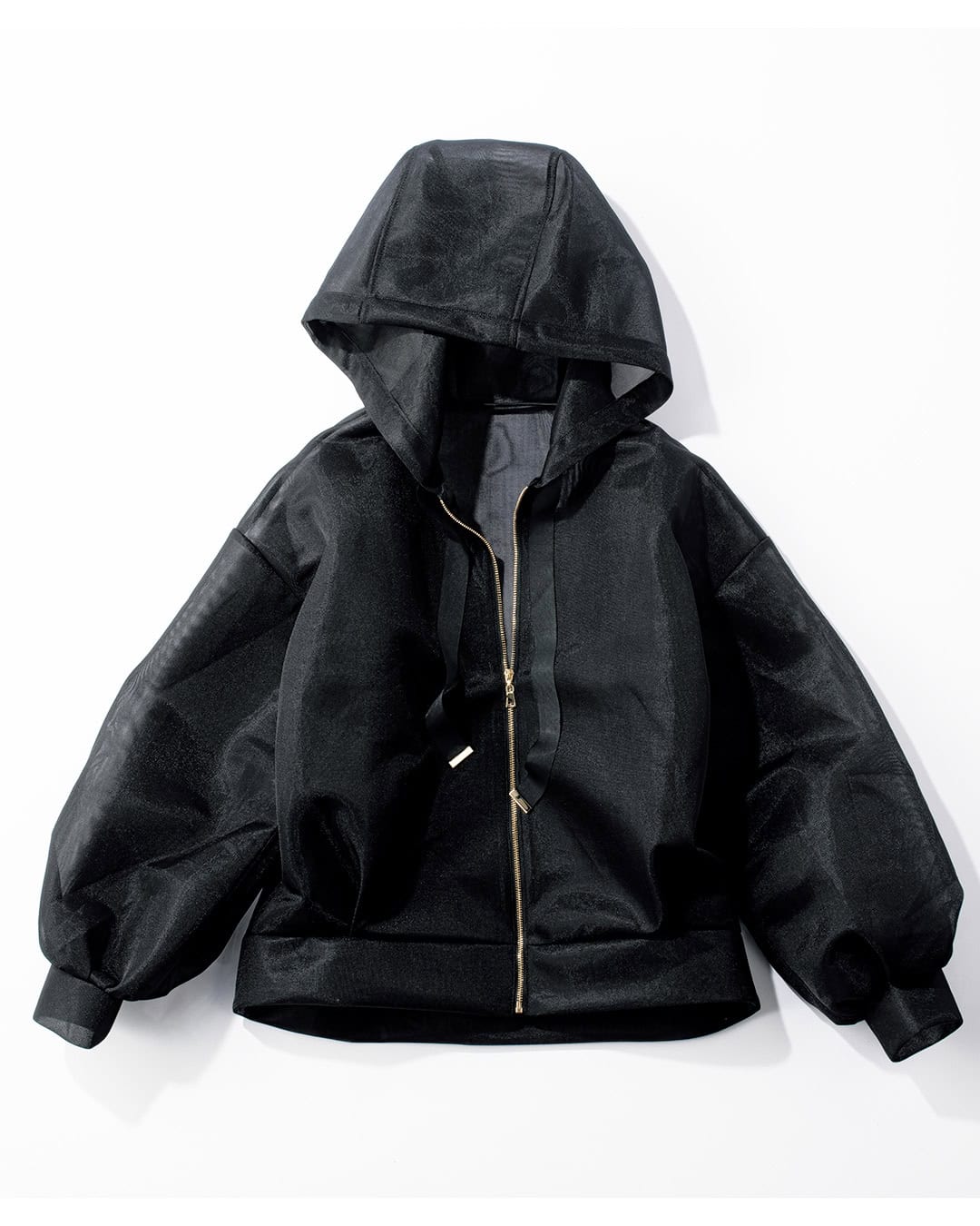 ちょっと羽織るのに今から夏まで使え、寒いうちは重ね着に一役買い、オシャレに余韻を残してくれるシアーなフーディです。裏毛のフーディと違い透け感のあるダンボール素材は何より軽い。さらに構築的なシルエットをつくりやすくスタイリッシュさが倍増します。スピンドルの代わりにリボン、ゴールドファスナーに金具でエレガントささえあるのが大人仕様です。