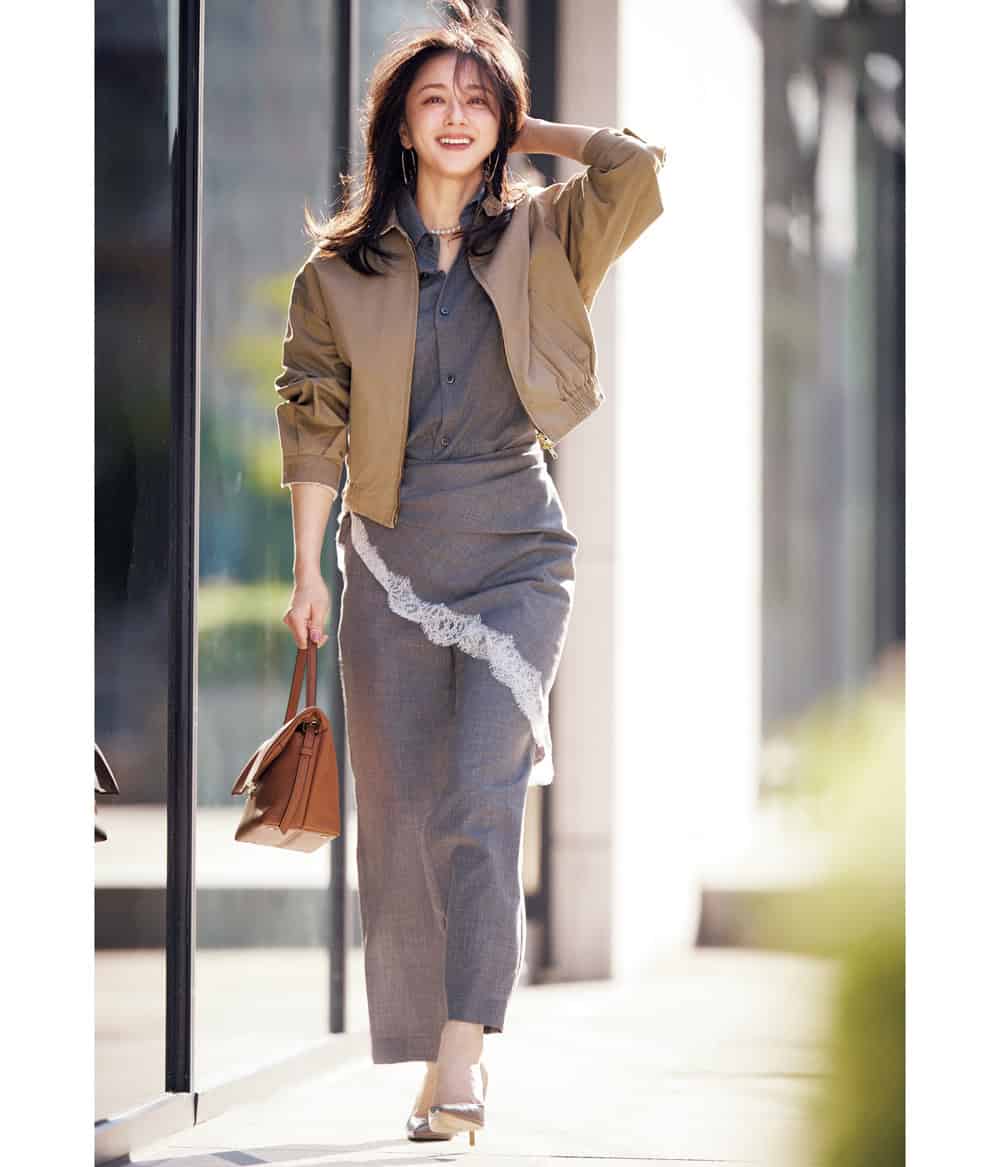 レース付きスカーフ¥60,500ブルゾン¥132,000シャツ¥66,000パンツ¥75,900(すべてマディソンブルー)バッグ¥49,500(プンティ/エルディスト ショールーム)パンプス¥18,150(ダイアナ/ダイアナ 銀座本店)ネックレス¥10,800(アビステ)