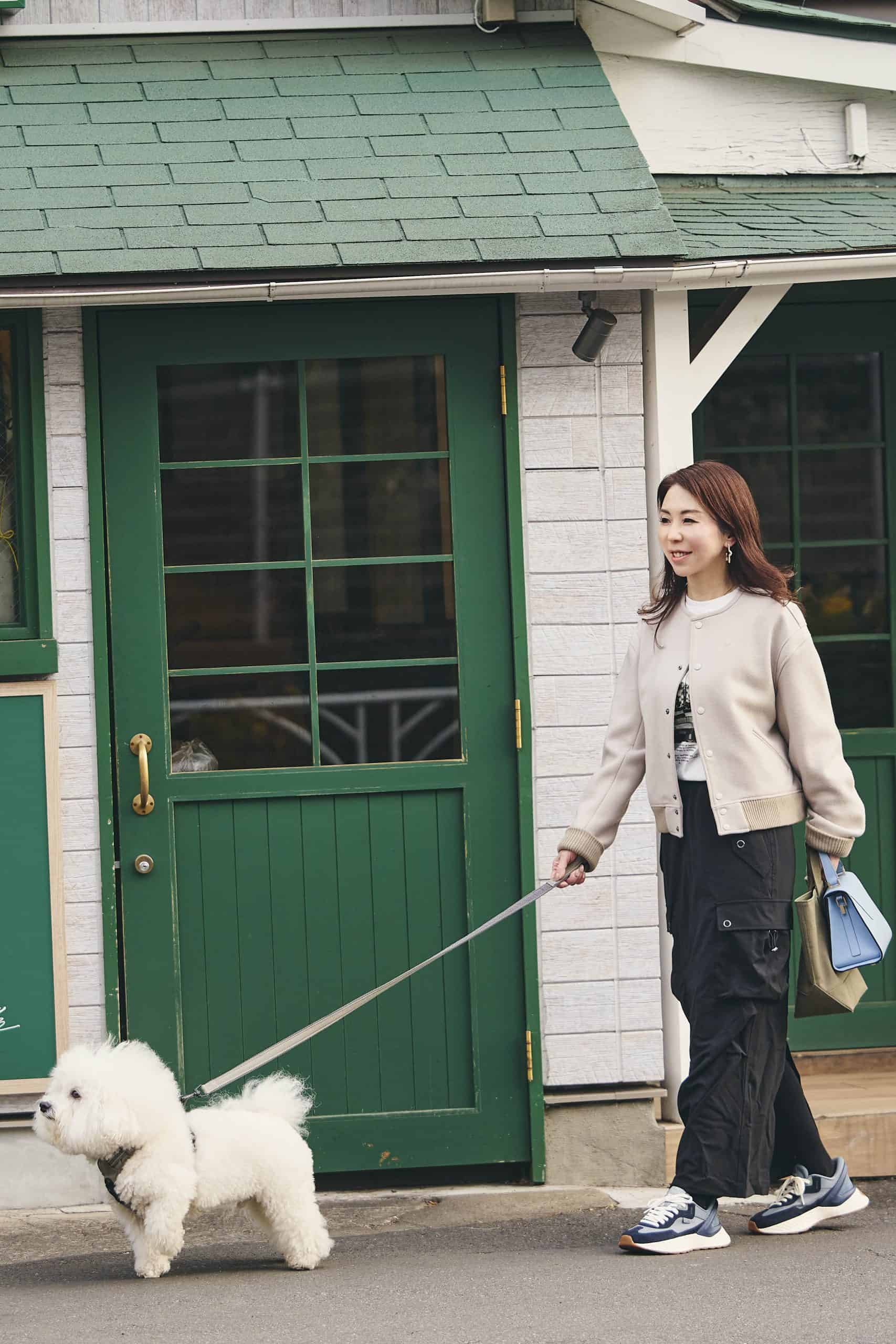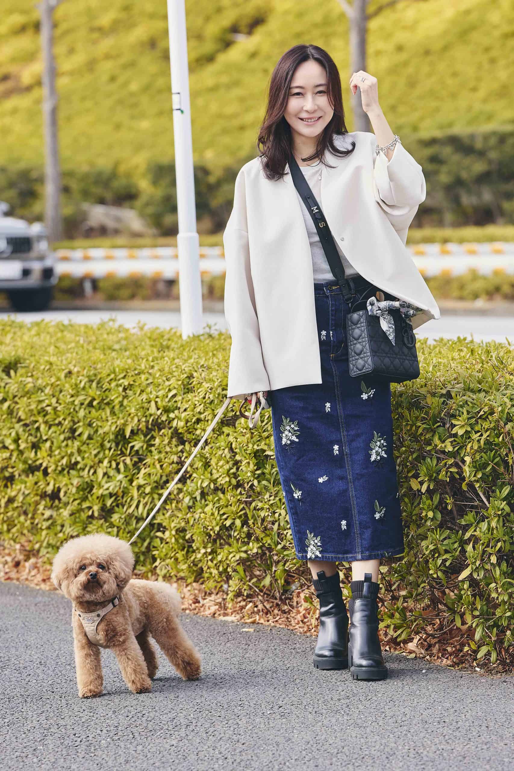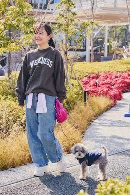 普段のお散歩では、わんこ友達と挨拶したり、飛びつかれたりすることも多いので、気を使いすぎずに過ごせるカラーやデニムなどを選ぶことが多いです。コーデは、なんとなく〝親子〟っぽさが出るように、ひじきとお揃いに見える雰囲気を意識しています。