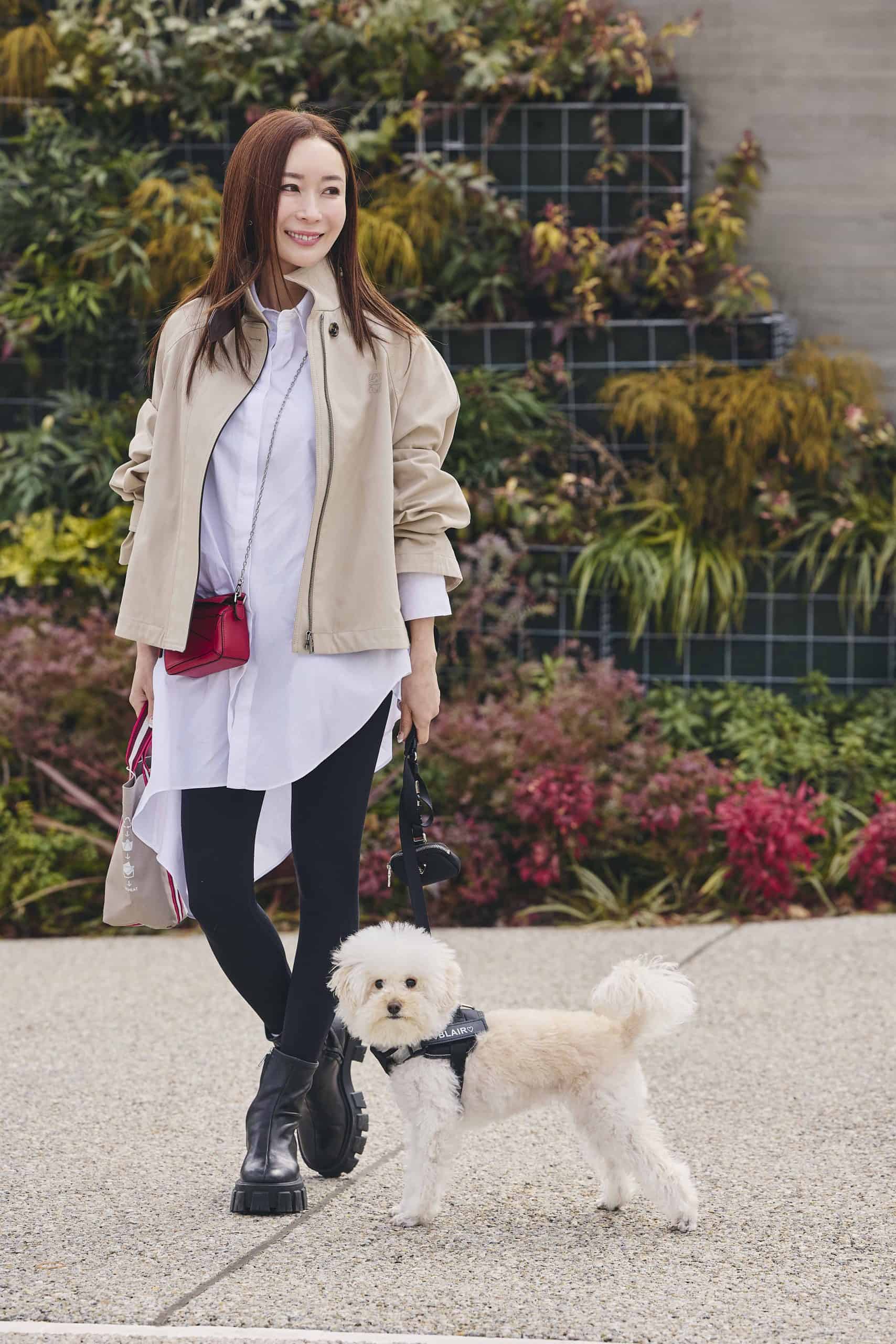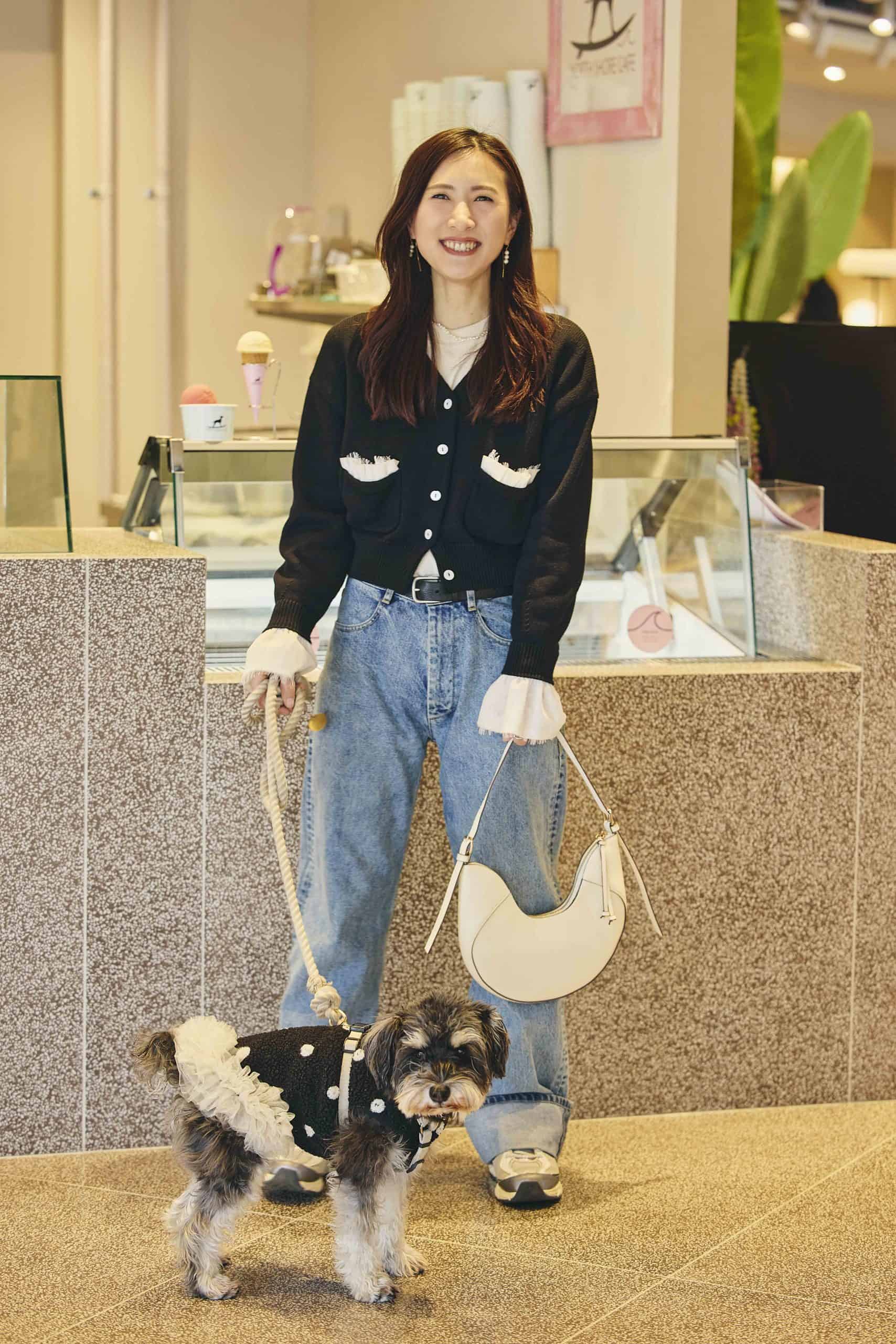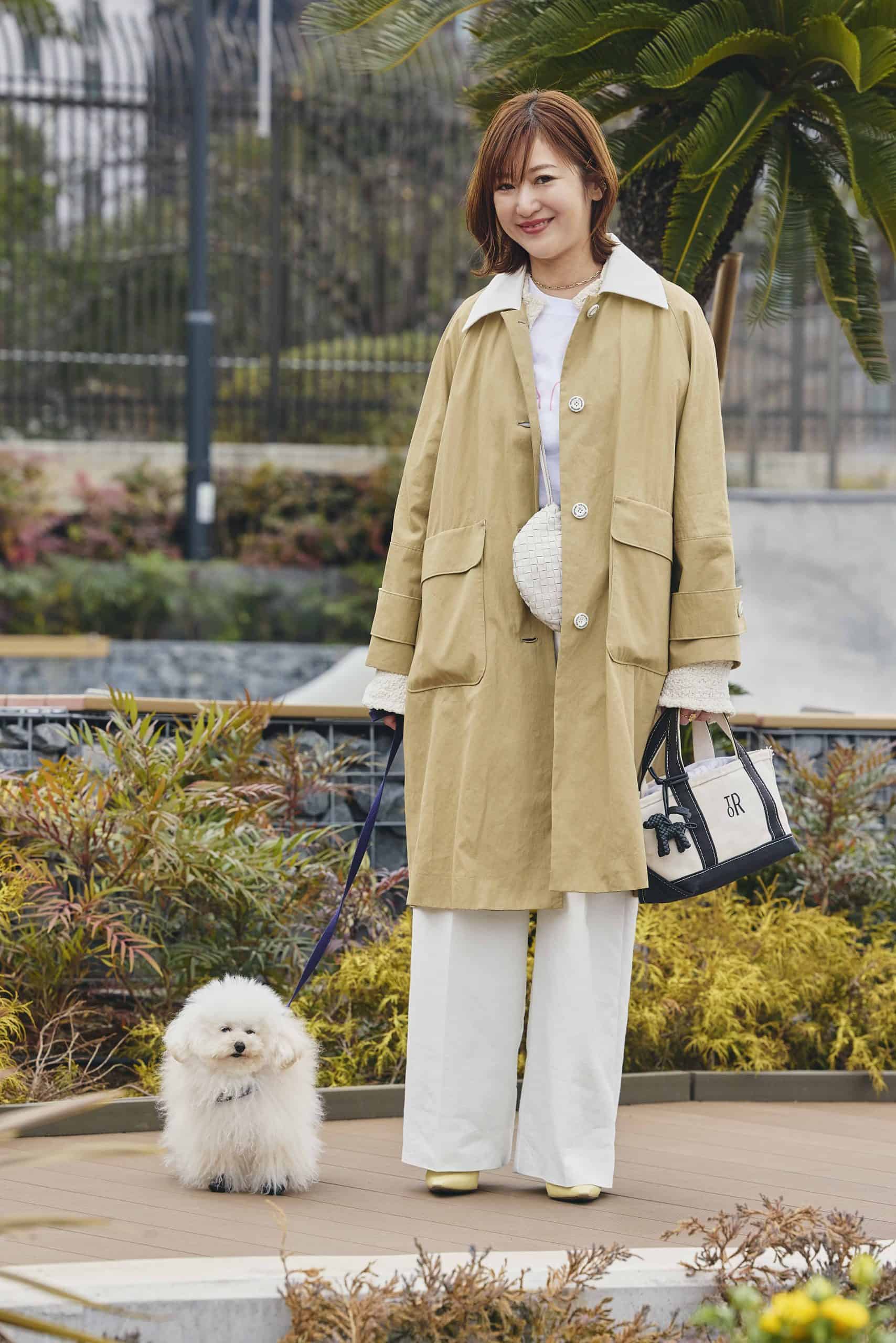 普段のお散歩では、わんこ友達と挨拶したり、飛びつかれたりすることも多いので、気を使いすぎずに過ごせるカラーやデニムなどを選ぶことが多いです。コーデは、なんとなく〝親子〟っぽさが出るように、ひじきとお揃いに見える雰囲気を意識しています。