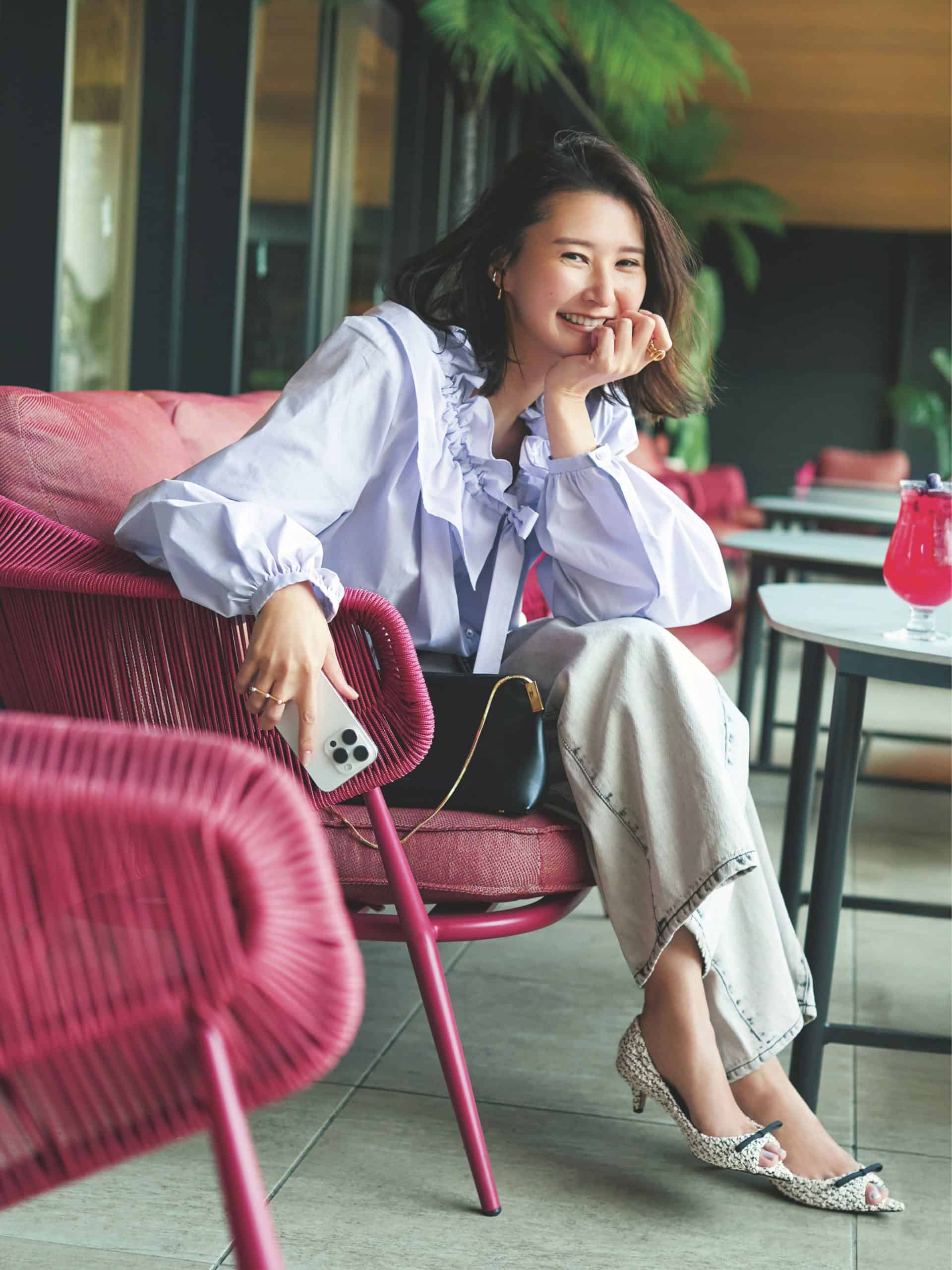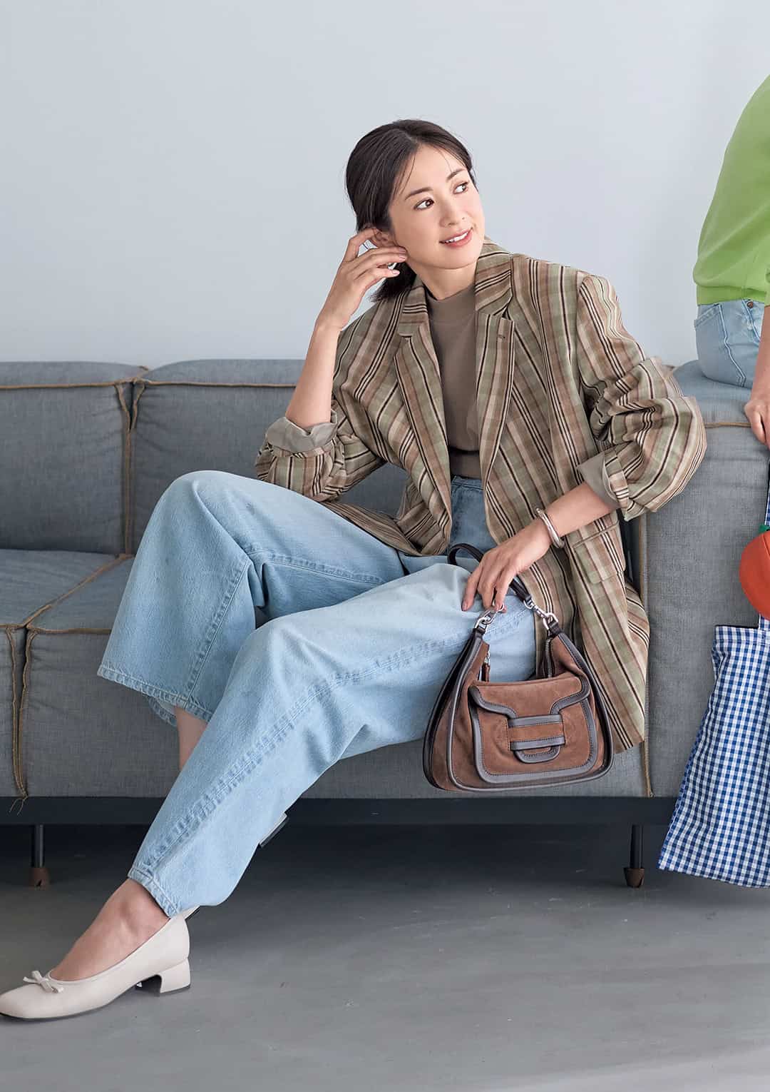 チェック柄ジャケットとリボン付き太ヒールという“お行儀のいい”コンビを、ラフなライトブルーデニムで着崩す感覚。それぞれが魅力を引き立て合う、理想的な上品カジュアル!淡いトーンも今っぽい。