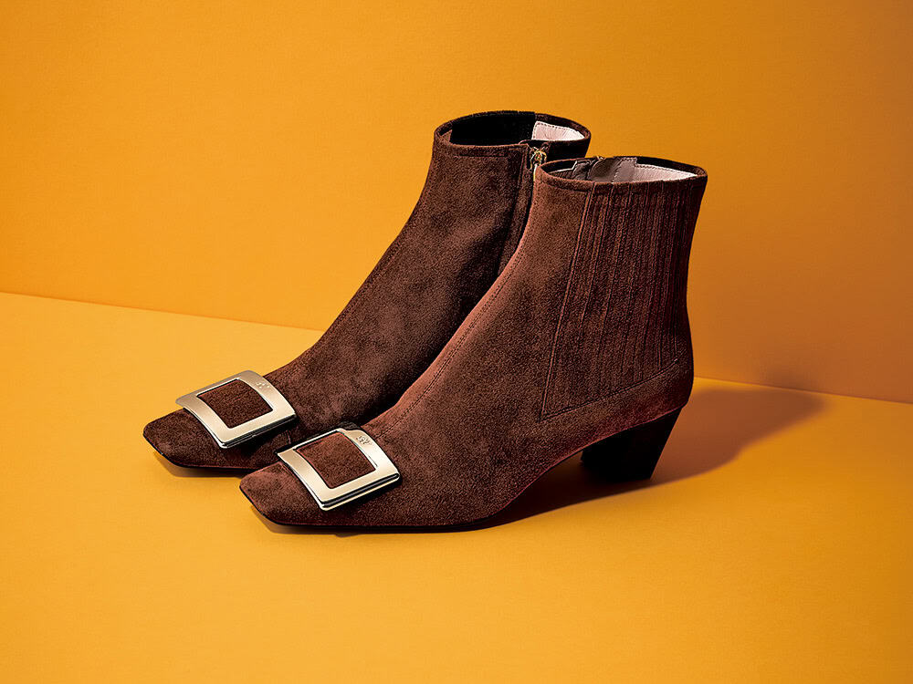 こっくりしたブラウンのスエード。金具がポイントです。ブーツ「ベルヴィヴィエ」〈H4.5㎝〉(ロジェ ヴィヴィエ/ロジェ・ヴィヴィエ・ジャパン)
