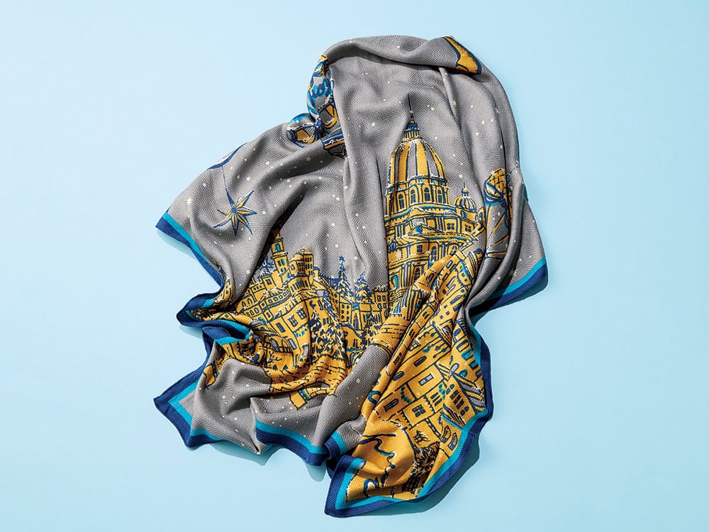 大判ストールはグレーベースにイエローの絵柄を施したアートのような一品。柔らかなウールシルク素材です。ストール(マニプリ)