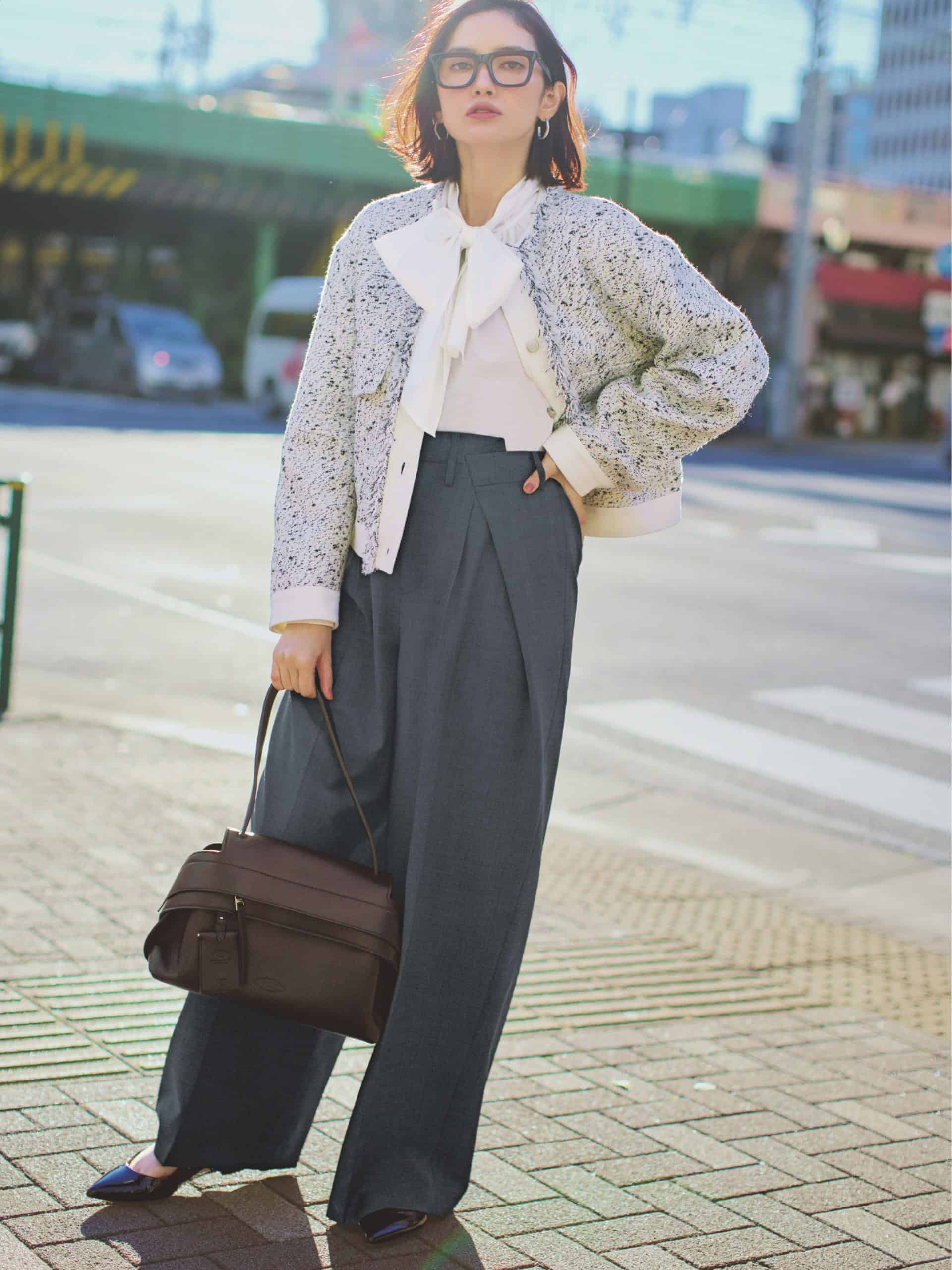 パンツ¥33,000(イウエン マトフ/ユナイテッドアローズ 渋谷スクランブルスクエア店)ブルゾン¥132,000(デパリエ/デパリエ 伊勢丹新宿店)ブラウス¥19,910(23区/オンワード樫山 お客様相談室)バッグ¥328,900(トッズ/トッズ・ジャパン)シューズ¥145,200(ジャンヴィト ロッシ/ジャンヴィト ロッシ ジャパン)メガネ¥49,500(モスコット/モスコット アオヤマ)ピアス¥28,600(ブランイリス/ブランイリストーキョー)